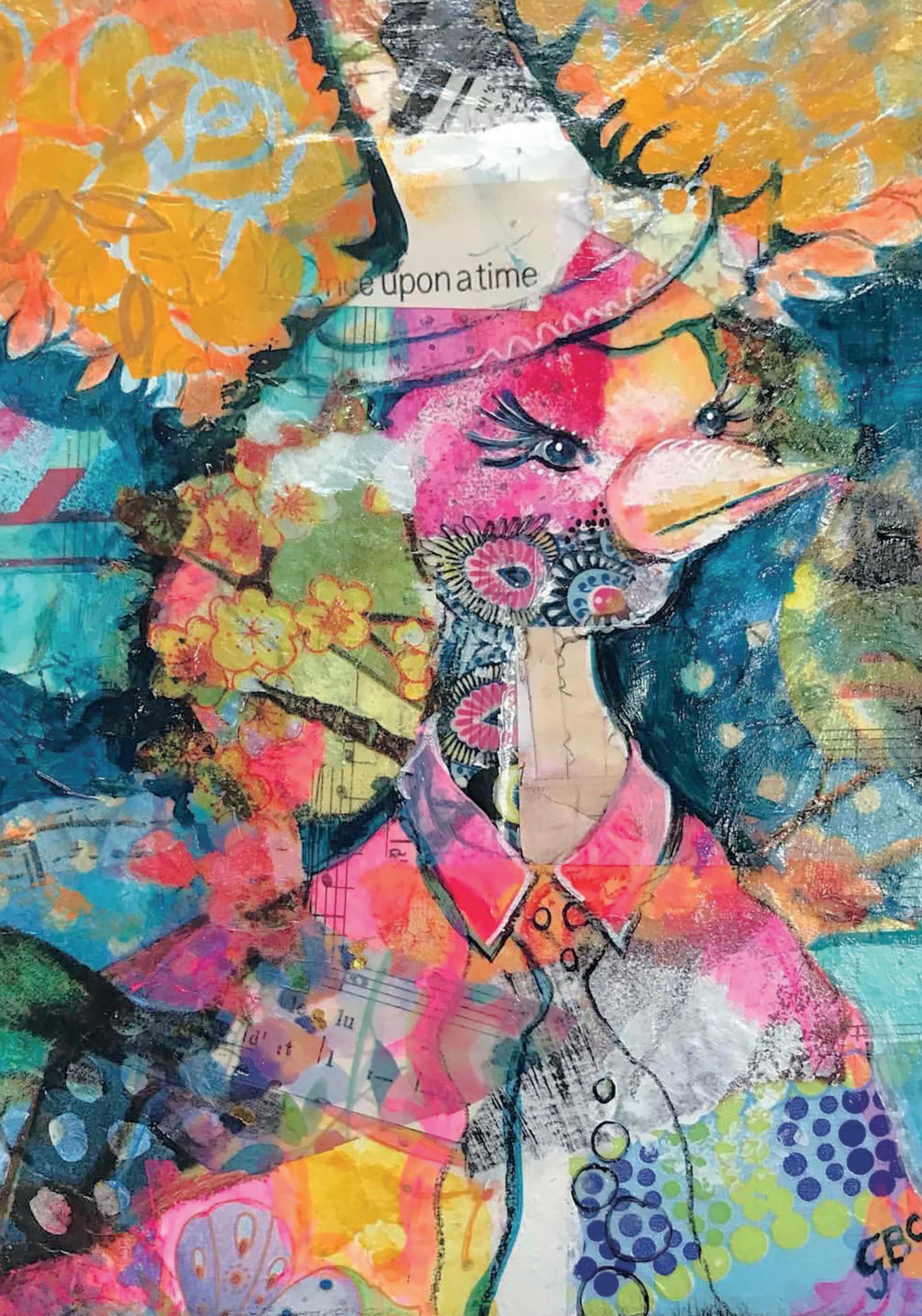 Out of a collaged background, a quirky bird emerges in his cloaked refinery. He was inspired by Gill’s love of eclectic fashion and pattern. “I love the clothes of Magnolia Pearl” explains Gill “and I was thinking of that brand when creating”. This particular piece was created during a workshop run by Carrie Swinburne.