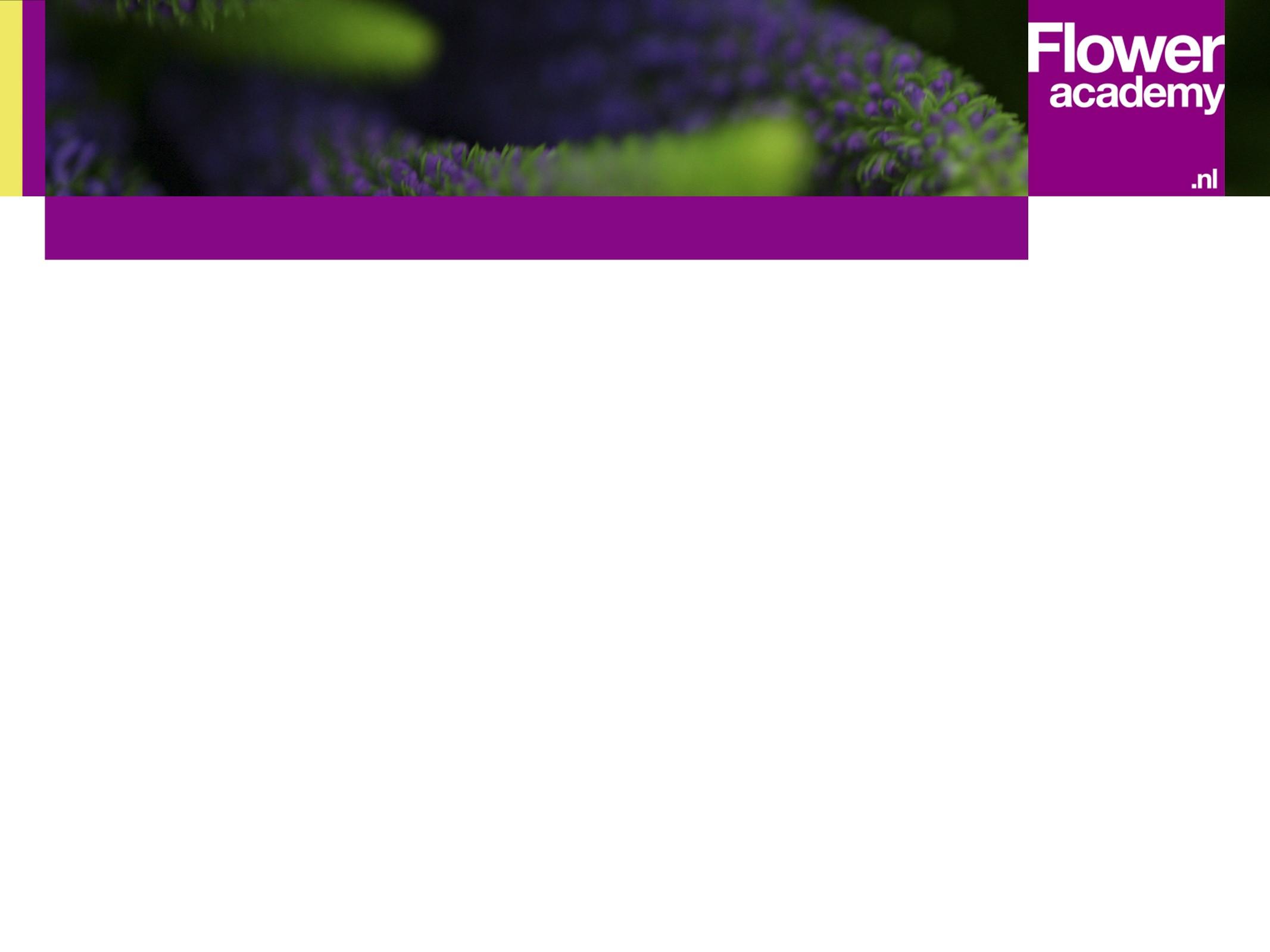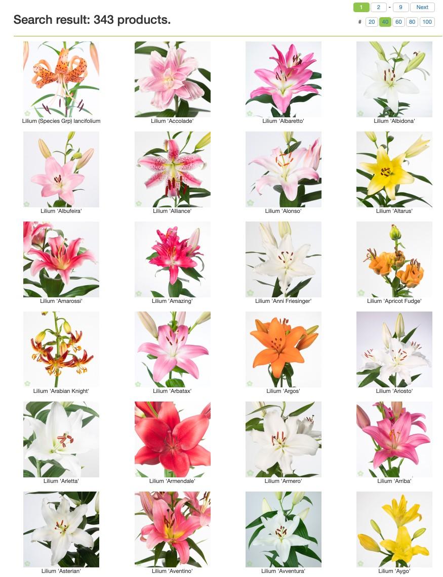 Types of Lilium Lilium Exotic flowers: Pretty much only imports Exotic flowers annual share from greenhouse NL Exotic flowers partly Dutch and partly import Exotic flowers mostly from the Netherlands, sometimes imports Forest schrubs: Forced Cut Flowers Summer flowers from annuals Impression Flower production Summer flowers from annuals Summer flowers from perennials Summer flowers from perennials Decorative foliage Availability cut flowers Rosa (spray and single roses differen head sizes