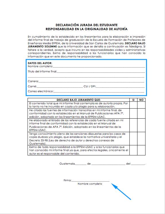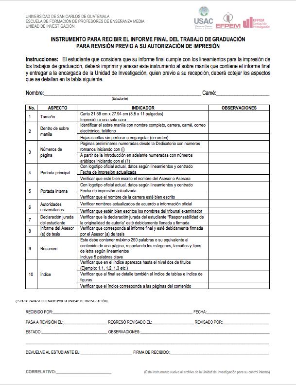Antes de entregar su informe final para solicitar su autorización de impresión, asegúrese de que las primeras páginas cumplan con los lineamientos de este documento. Se sugiere utilizar el instrumento siguiente: