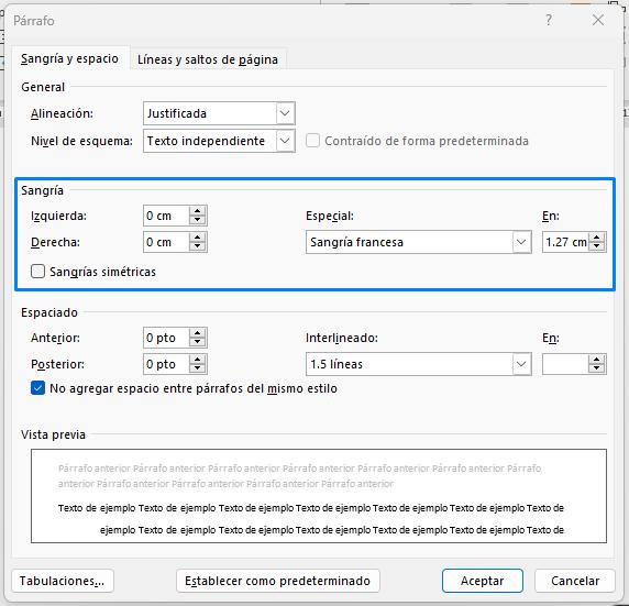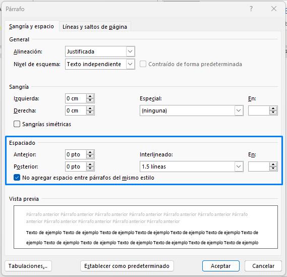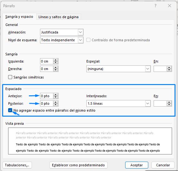 TIP: revise en su documento de Word en el menú Párrafo y configure en Espaciado así: 0 anterior y 0 posterior, interlineado 1.5 líneas y seleccione la casilla de no agregar espacio entre párrafos del mismo estilo