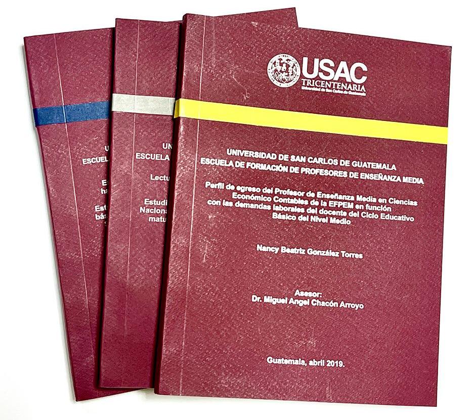 Al contar con la autorización de impresión de la Secretaría Académica el trabajo debe ser llevado a una imprenta formal, con experiencia en elaboración de tesis, para que de acuerdo a estas normas reproduzcan los ejemplares que sean requeridos para el proceso de graduación.