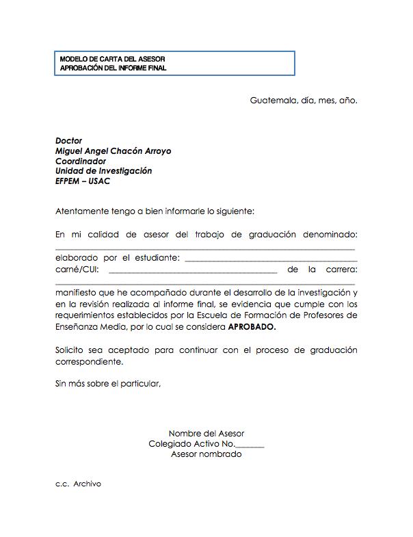 • Carta de aprobación del asesor (a) o supervisor (a)