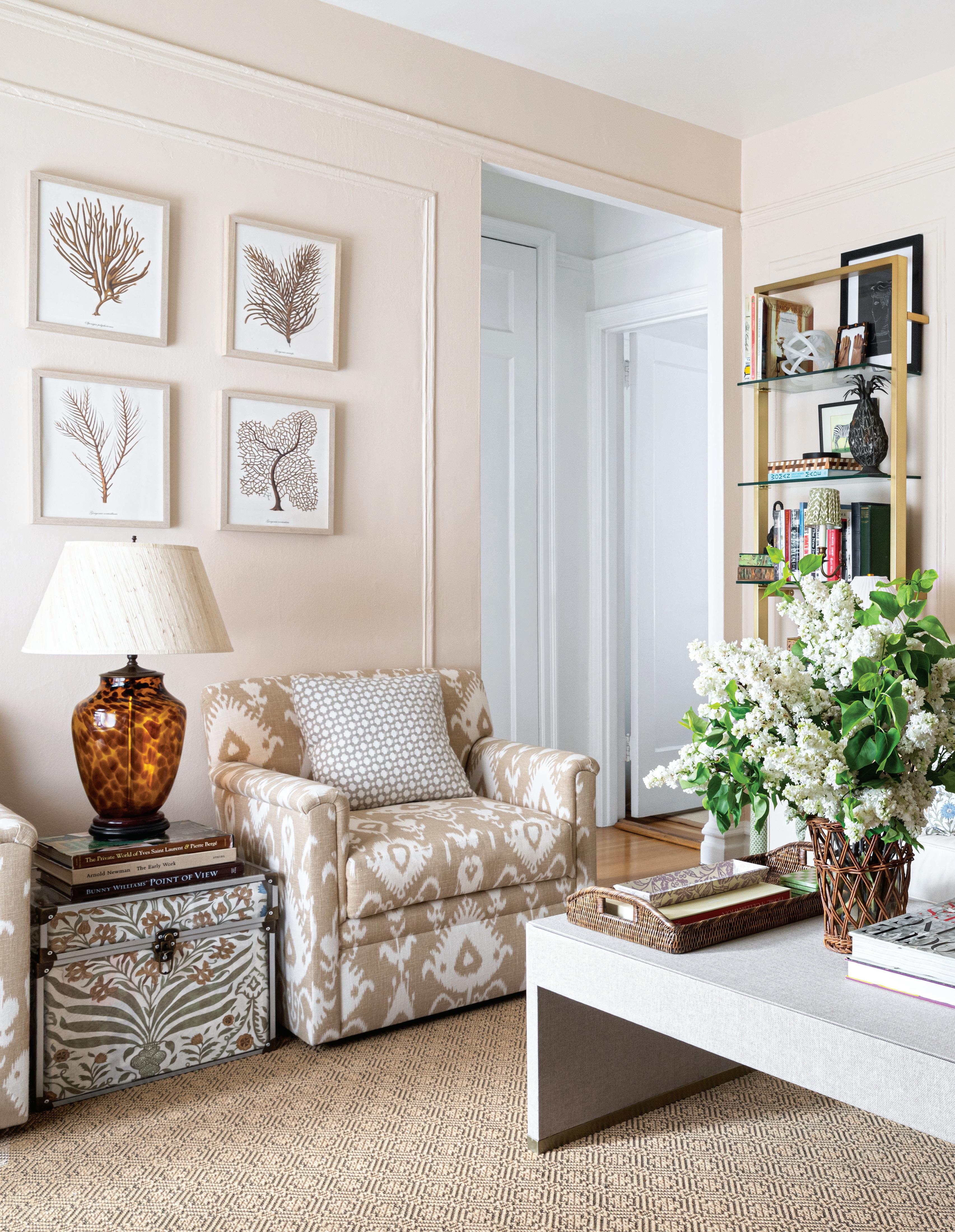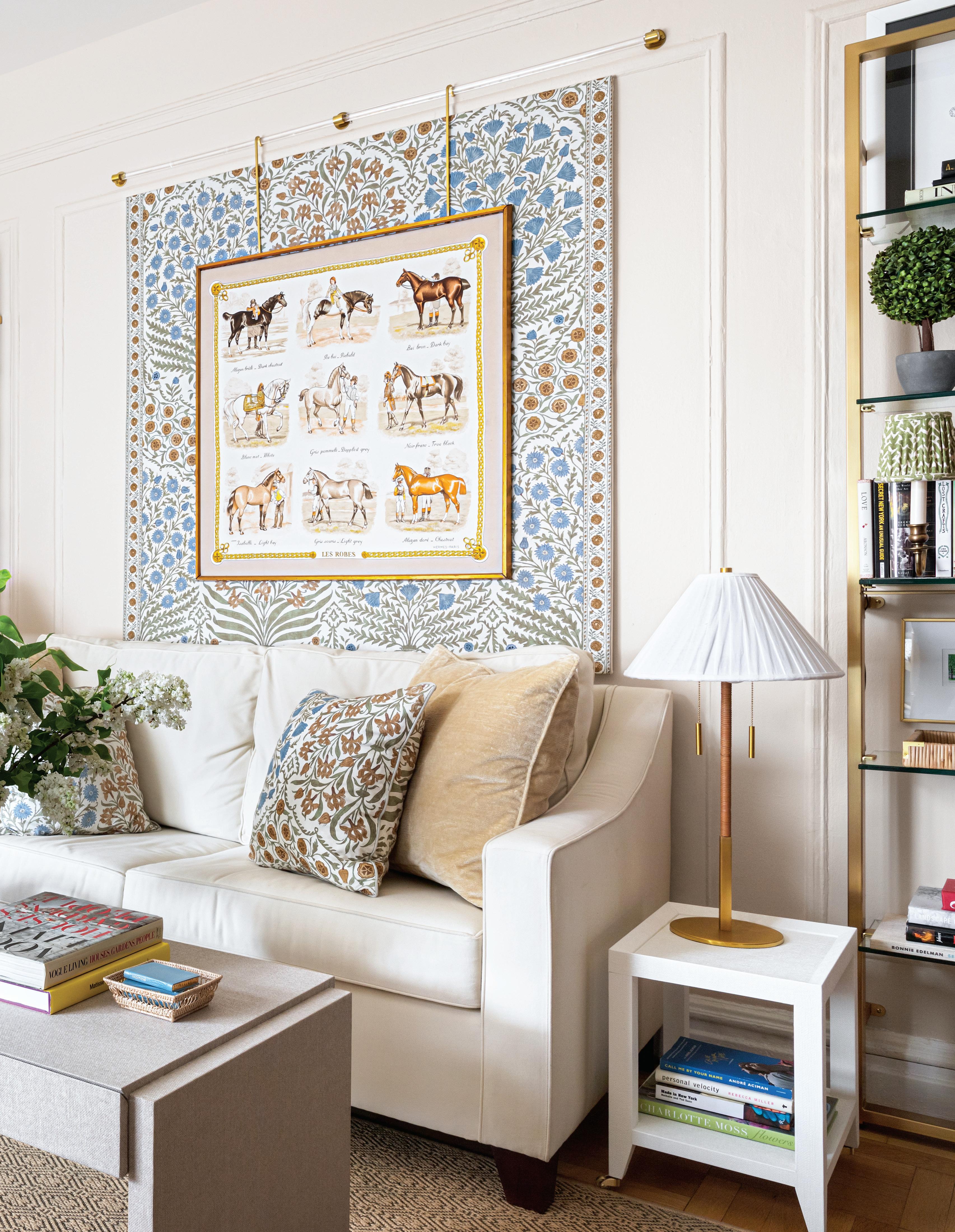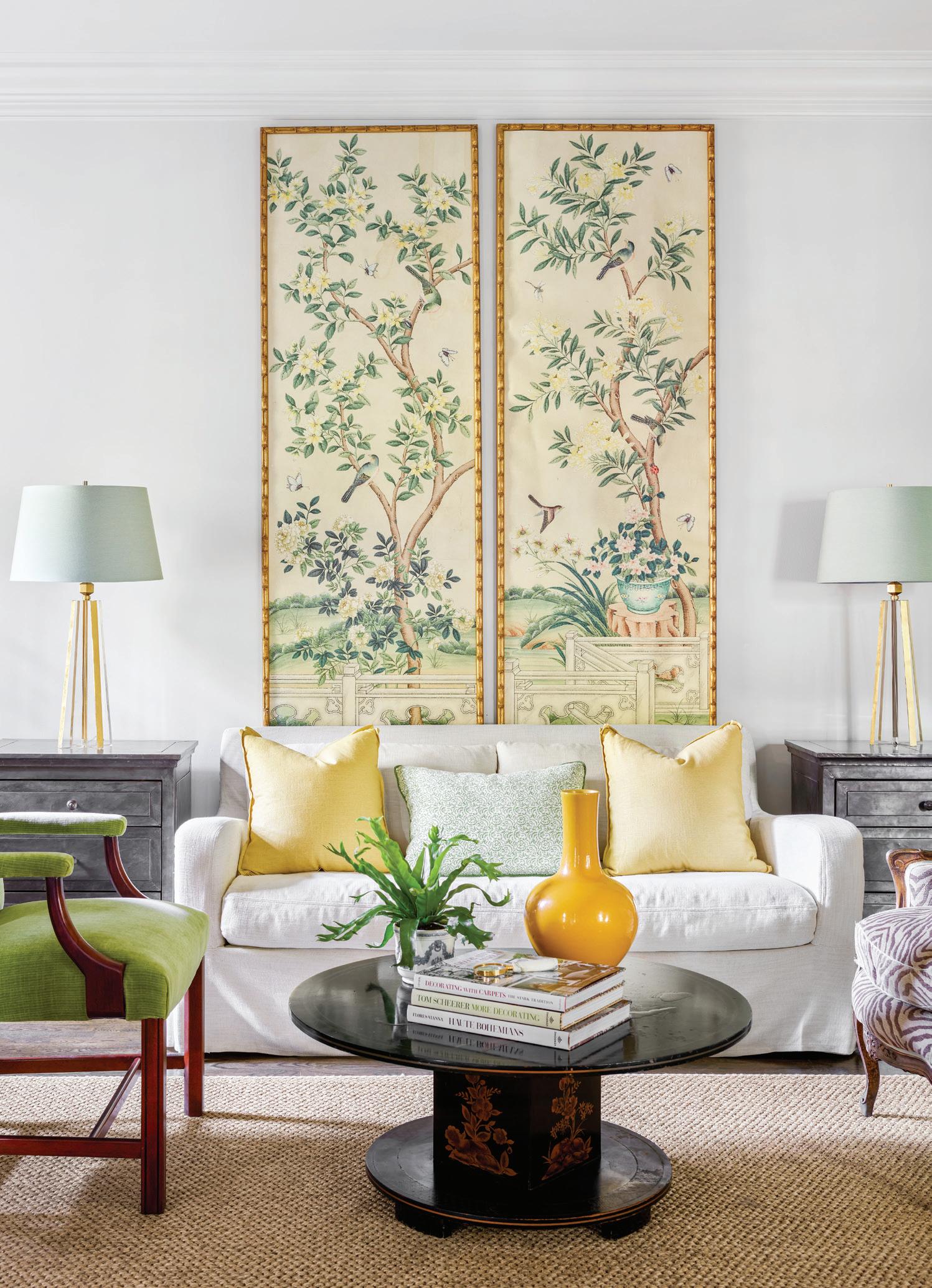 LIVING ROOM: Paint color: ‘Swiss Coffee’ by Benjamin Moore, benjaminmoore. com; chinoiserie fabric: Brunschwig & Fils, kravet.com; lampshade fabric: Peter Fasano, peterfasano.com; yellow pillow fabric: Heather Chadduck, heatherchadducktextiles.com; end tables: Holland MacRae, hollandmacrae.com;