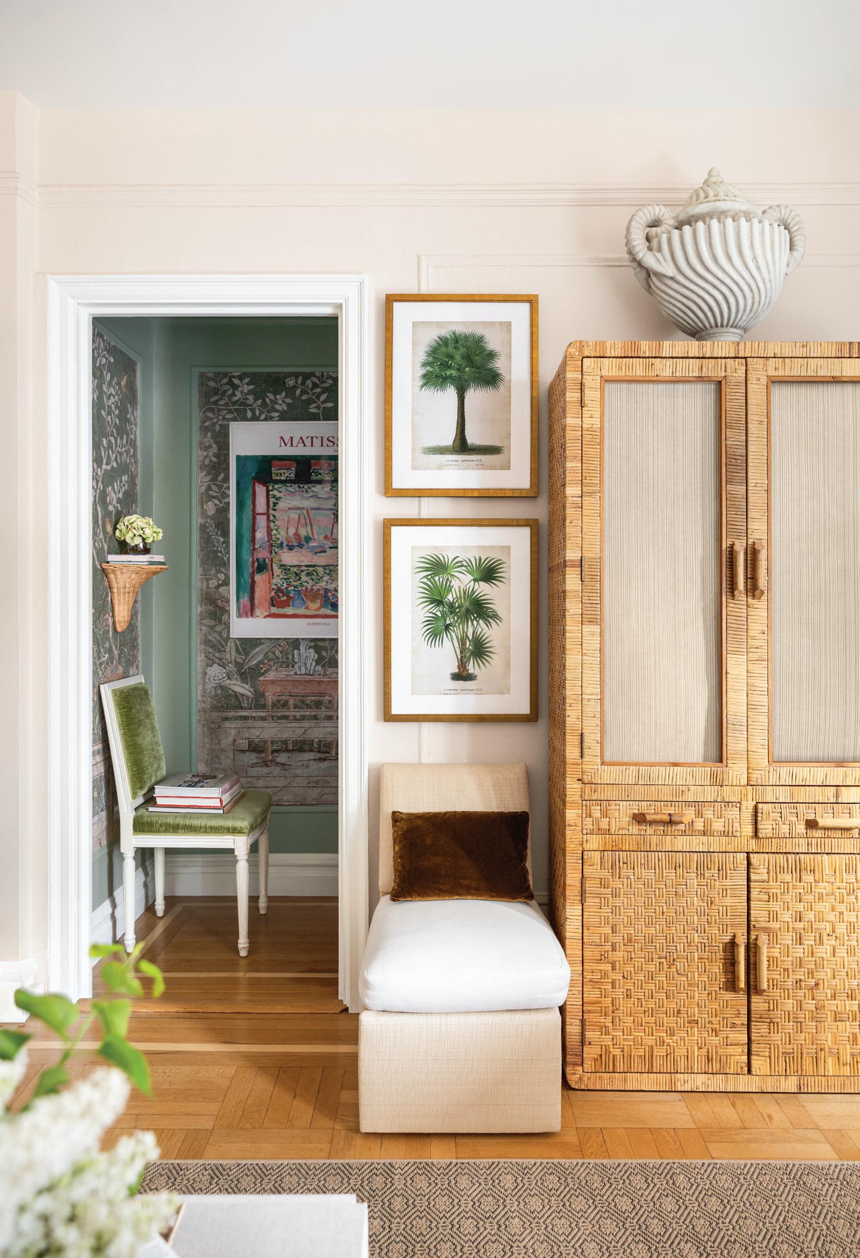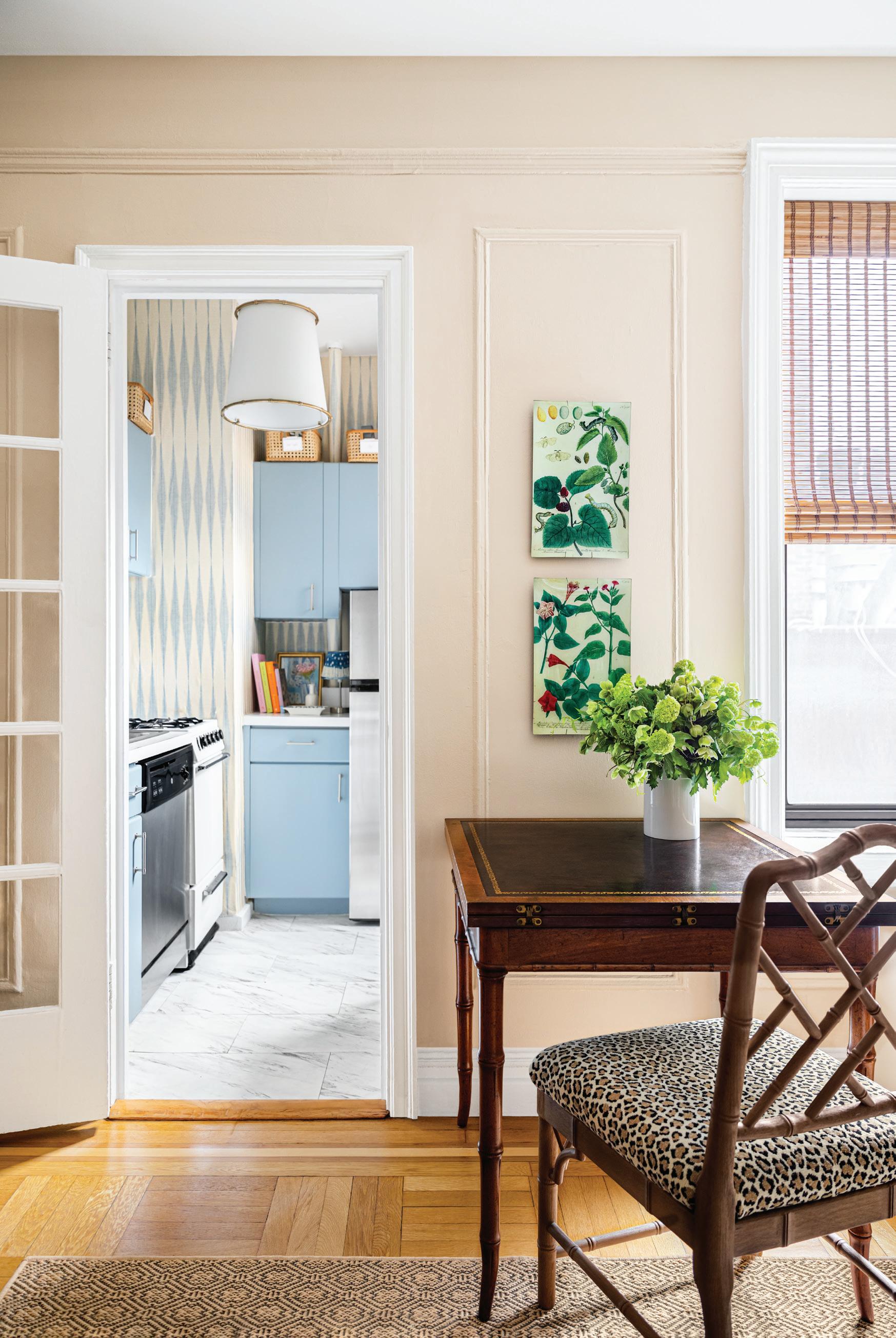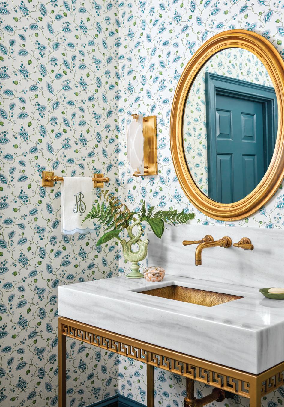 POWDER ROOM: Wallpaper: Schumacher, schumacher.com; vanity: Lucy Smith through Holland MacRae, hollandmacrae. com; sconces: Visual Comfort, visualcomfort.com; KITCHEN: Fabric: Raoul Textiles, raoultextiles.com, barstools: Wesley Hall, wesleyhall.com; VESTIBULE: Wallpaper: Peter Fasano, peterfasano. com; PRIMARY BEDROOM: Linens: Matouk Schumacher Collection, matouk.com; chest: Tritter Feefer, tritterfeefer.com; bedside tables: Villa & House, vandh.com; lamps on bedside tables: Christopher Spitzmiller for Visual Comfort, visualcomfort.com; fabric on bench (in front of bed):