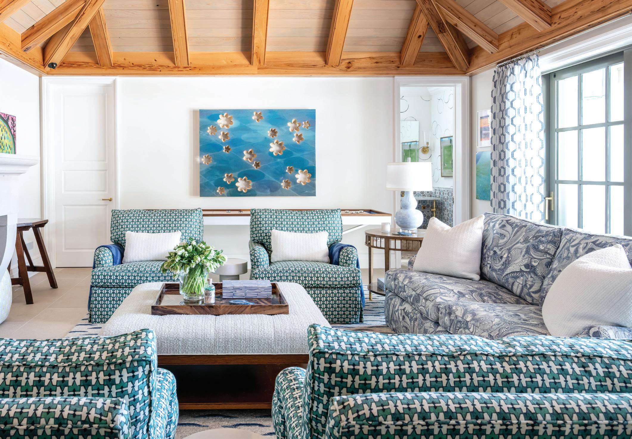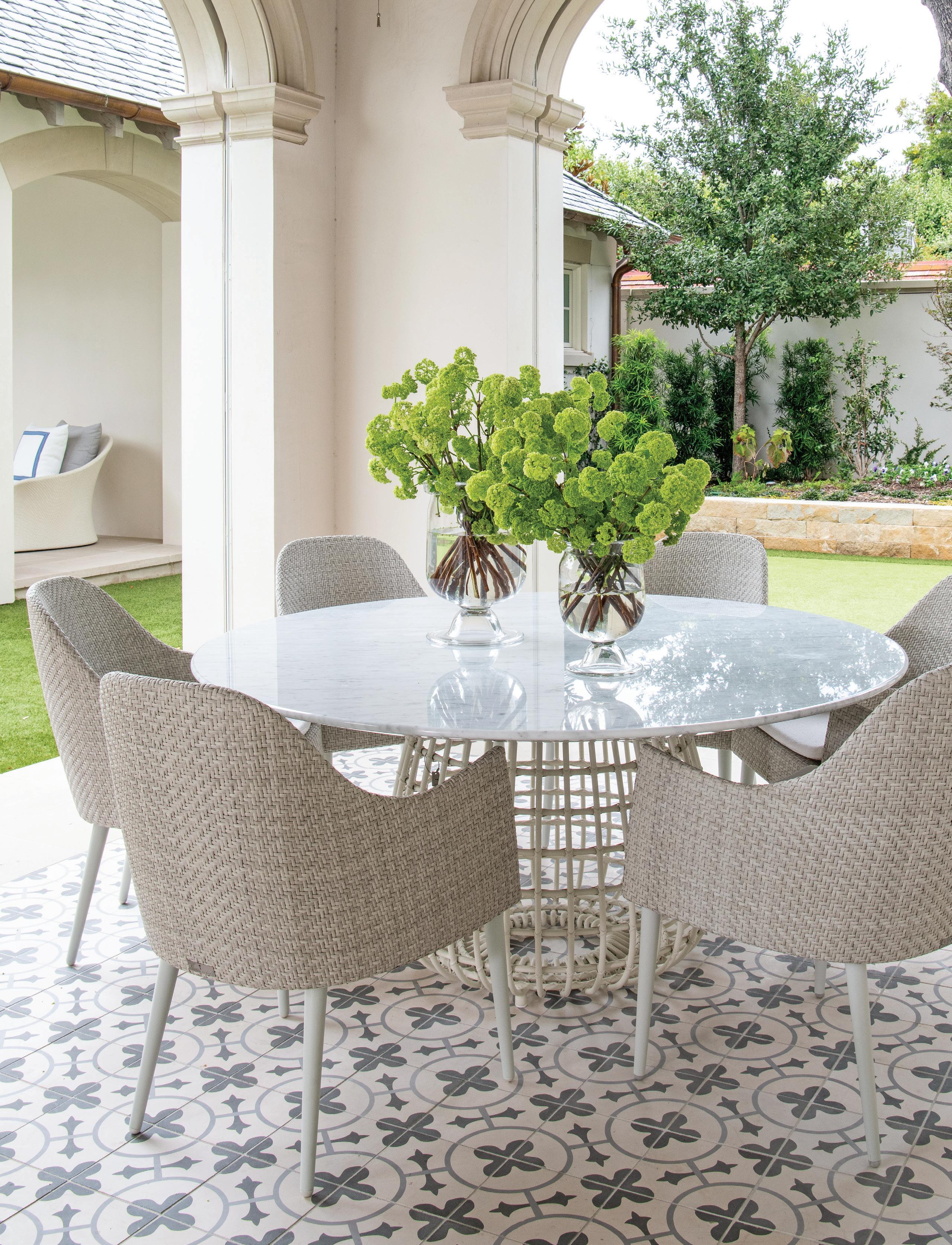 THIS PAGE, CLOCKWISE FROM TOP: The vaulted pool house with its comfy furnishings provides a gathering spot to escape the heat. Whimsical artwork by Donald Moffett adds to the relaxed vibe. • A mosaic tile, used as wainscotting in the bath, is topped with a wispy circle wallpaper from Studio E. • The pavilion has many options for seating; this one looks out on the pool. OPPOSITE: In an outdoor eating area, bunches of ‘Little Lime’ hydrangeas speak to the summer season.