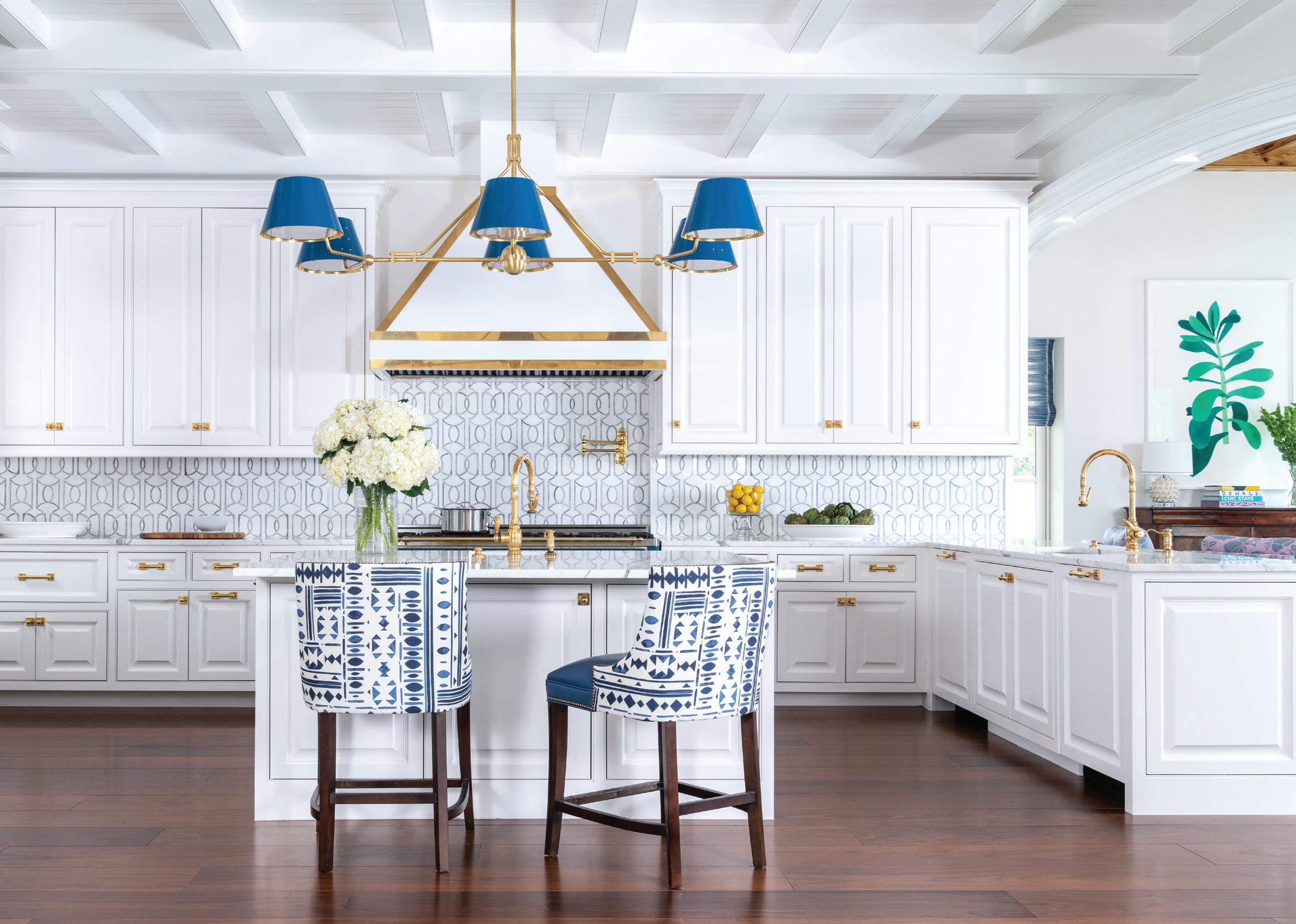OPPOSITE, TOP TO BOTTOM: The lower-level lounge is the ultimate hangout spot with a bar and an adjacent room that houses a golf simulator. • Brass strapping on the vent pairs with brass hardware and fixtures to bring a bit of shine to the classic white kitchen. An Urban Electric light fixture with custom shades and an Imogen Heath print on the chairs add bolts of blue. The green botanical painting is by Jonas Wood. THIS PAGE, TOP TO BOTTOM: A geometric-style print from Lindsay Cowles adds liveliness to a custom bench and bed pillows in the primary suite. • For a girl’s dream of a bedroom, Kara injected a bright pink Highland House fabric for the window panels with a Hickory Chair bed dressed in a playful Ferrick Mason blue-and-white botanical print.