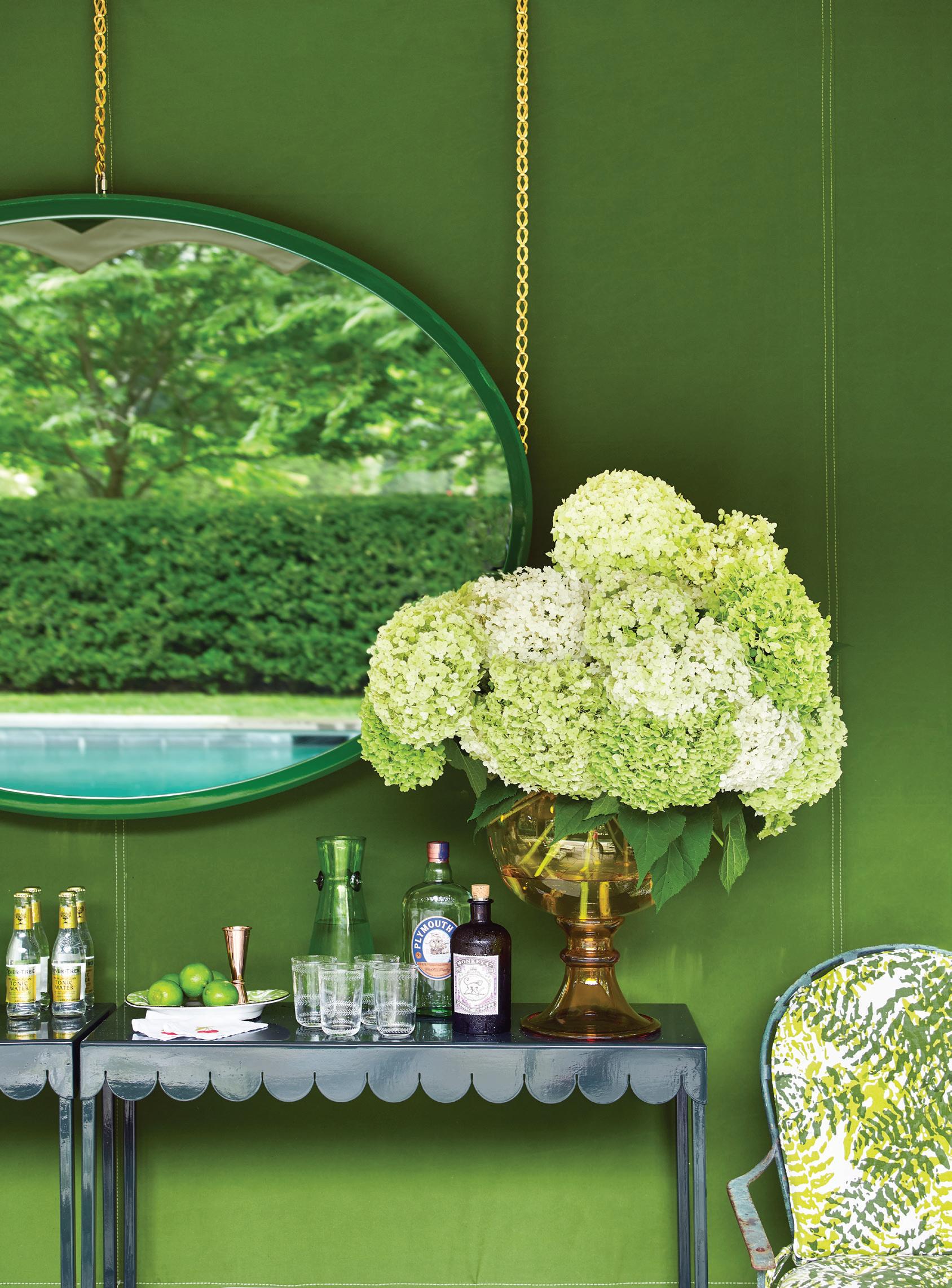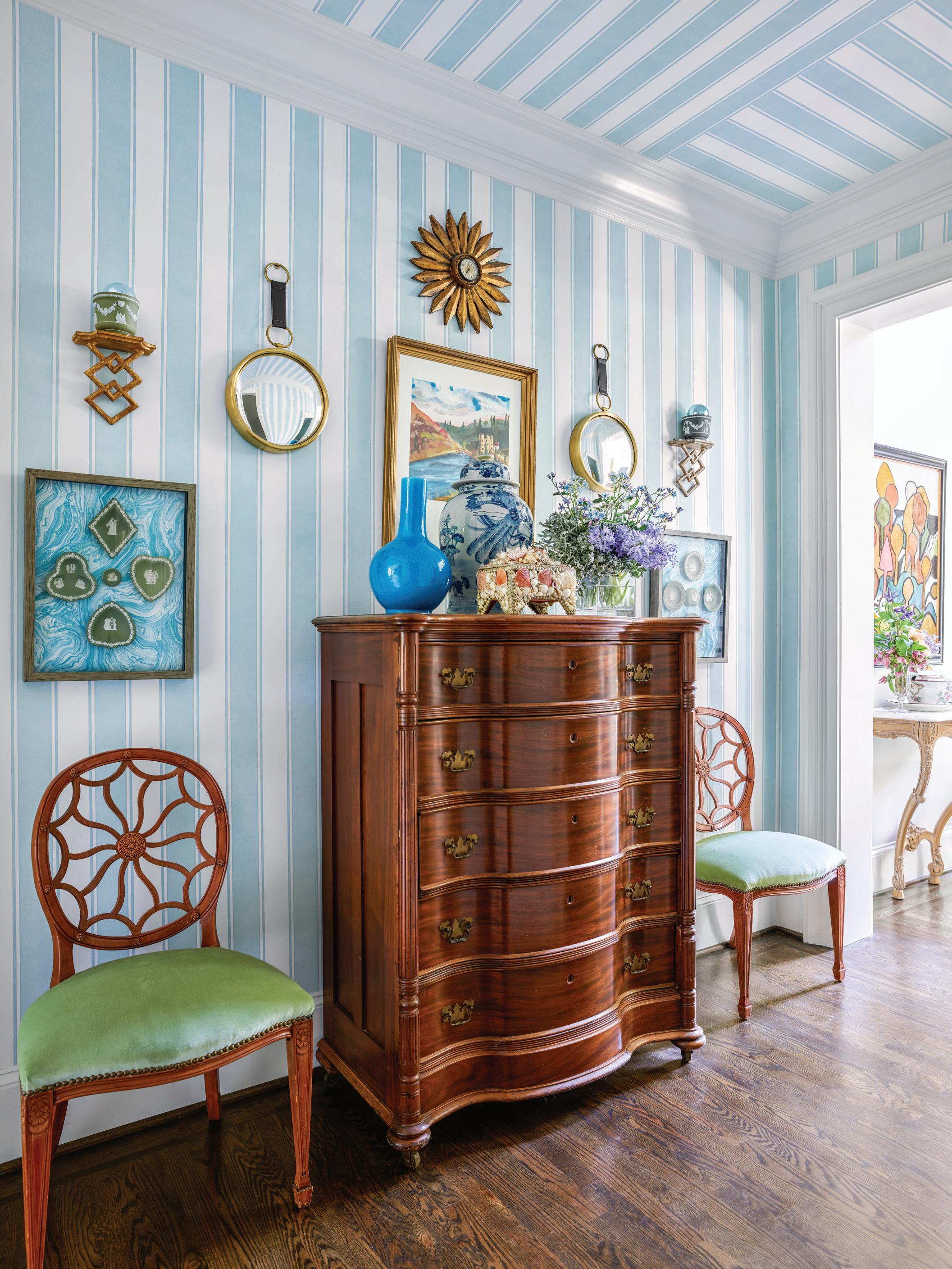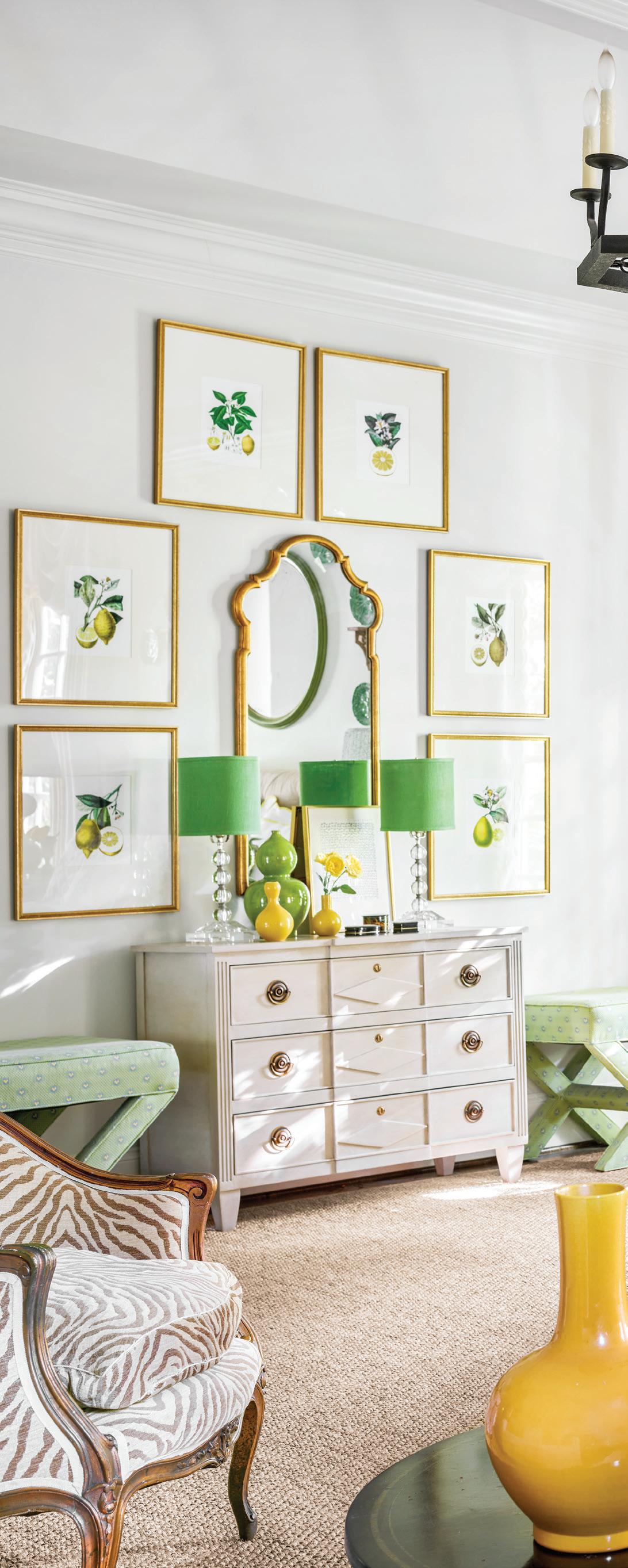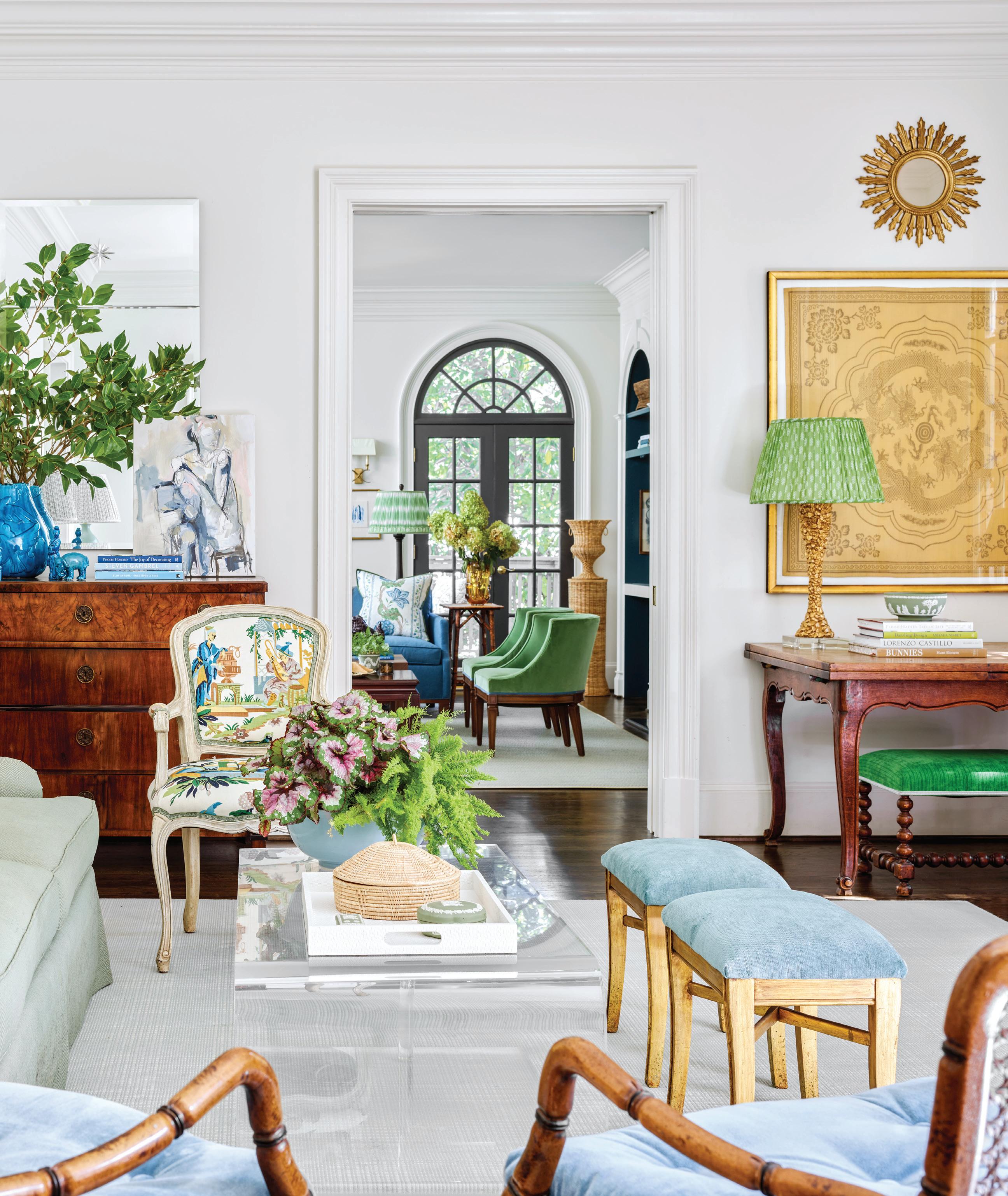 SECOND ACT: PAGES 32-43: Interior designer: Heather Dewberry Stoller, HuffDewberry, huffdewberry.com; ENTRY: Brown velvet on settee: Schumacher, schumacher.com; green velvet on stool: Lee Jofa, kravet.com; DINING ROOM: Wallpaper: Gracie Studio, graciestudio. com; chandelier: Visual Comfort, visualcomfort.com; mirror: Michael S. Smith for Mirror Home, mirrorhome.com;