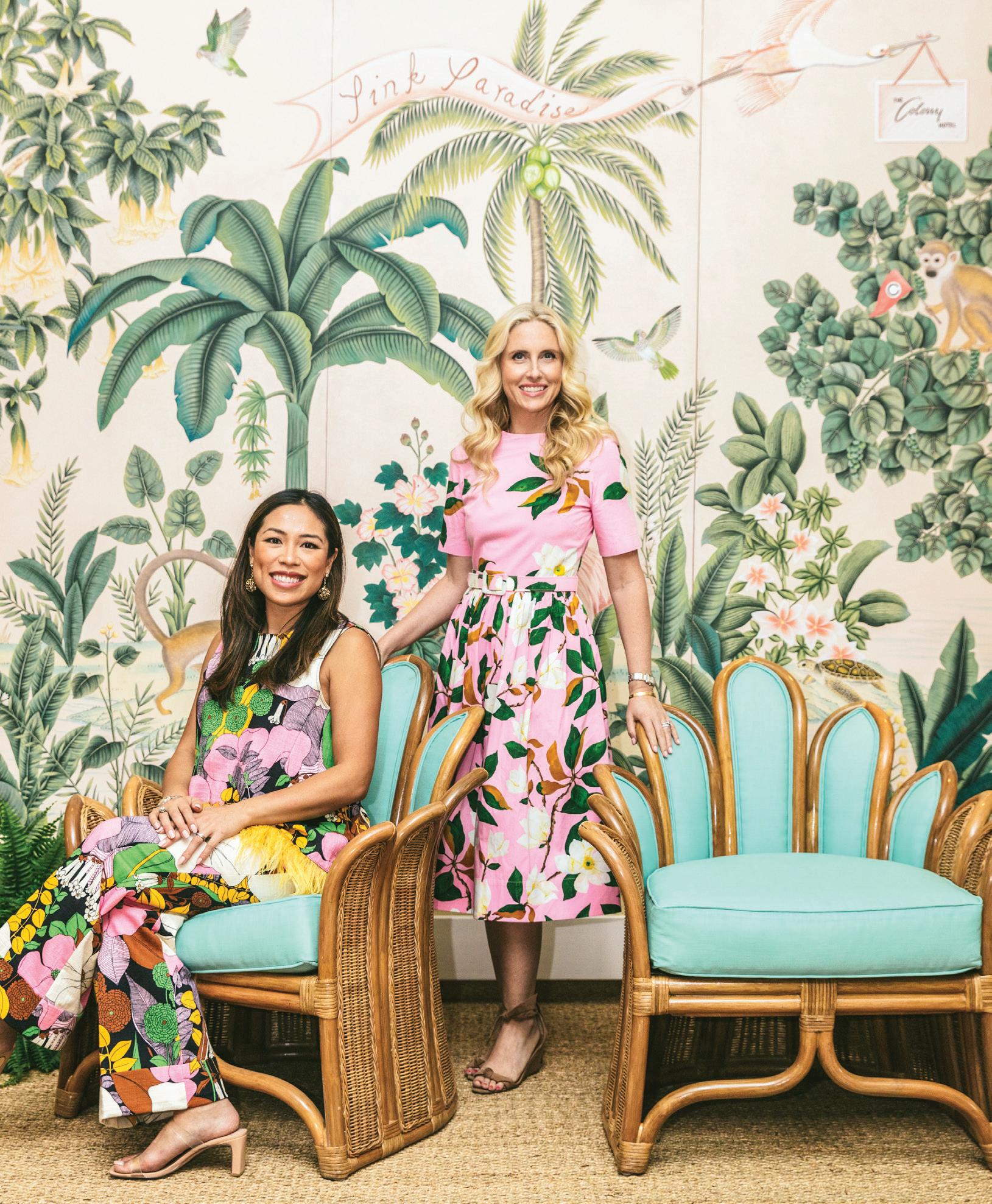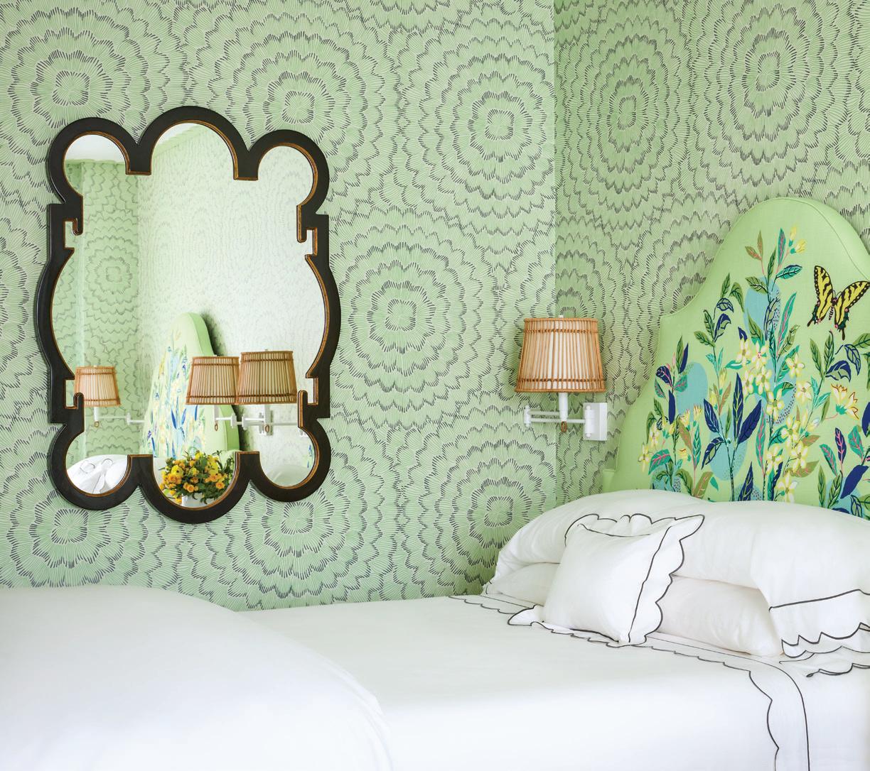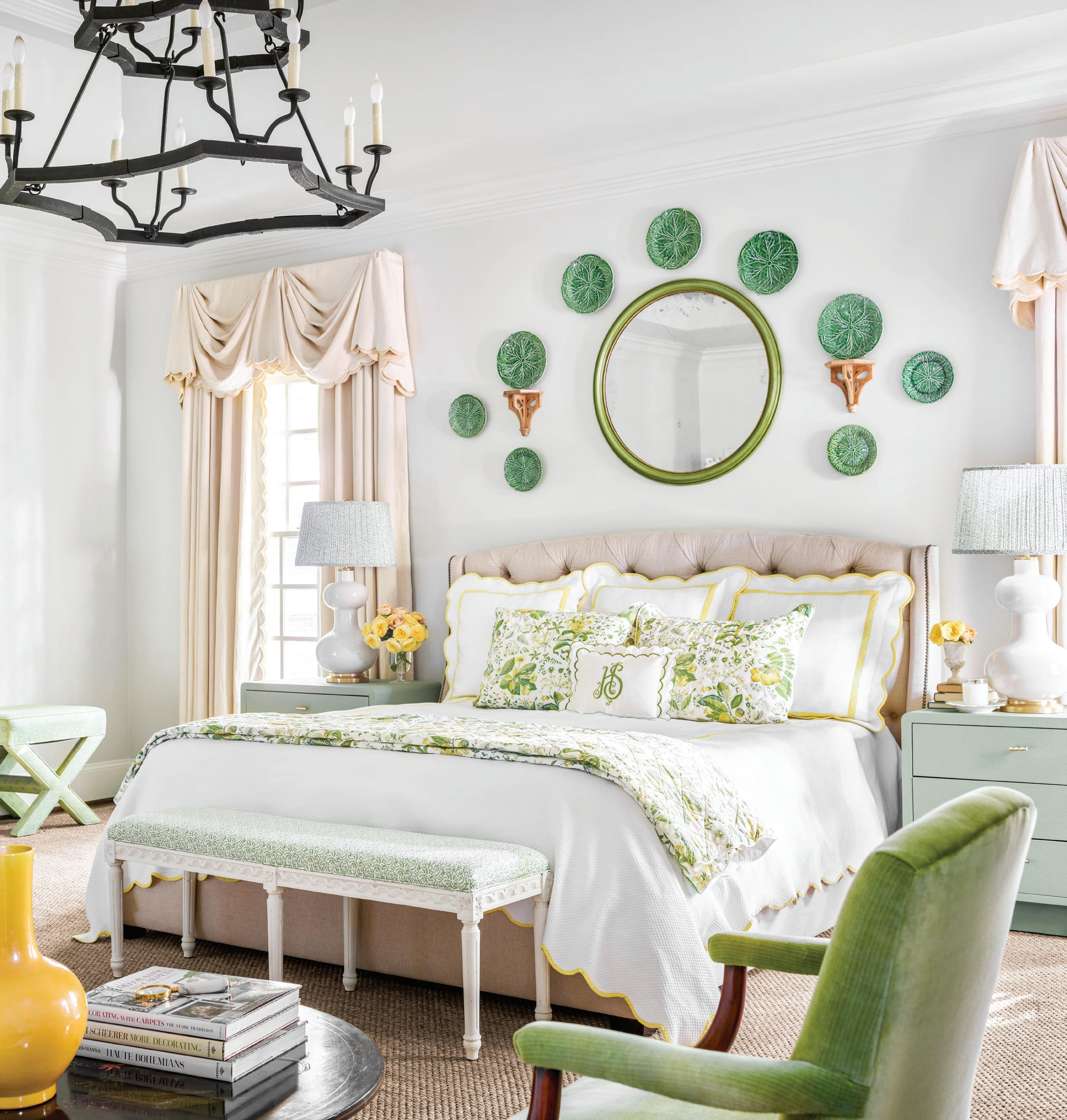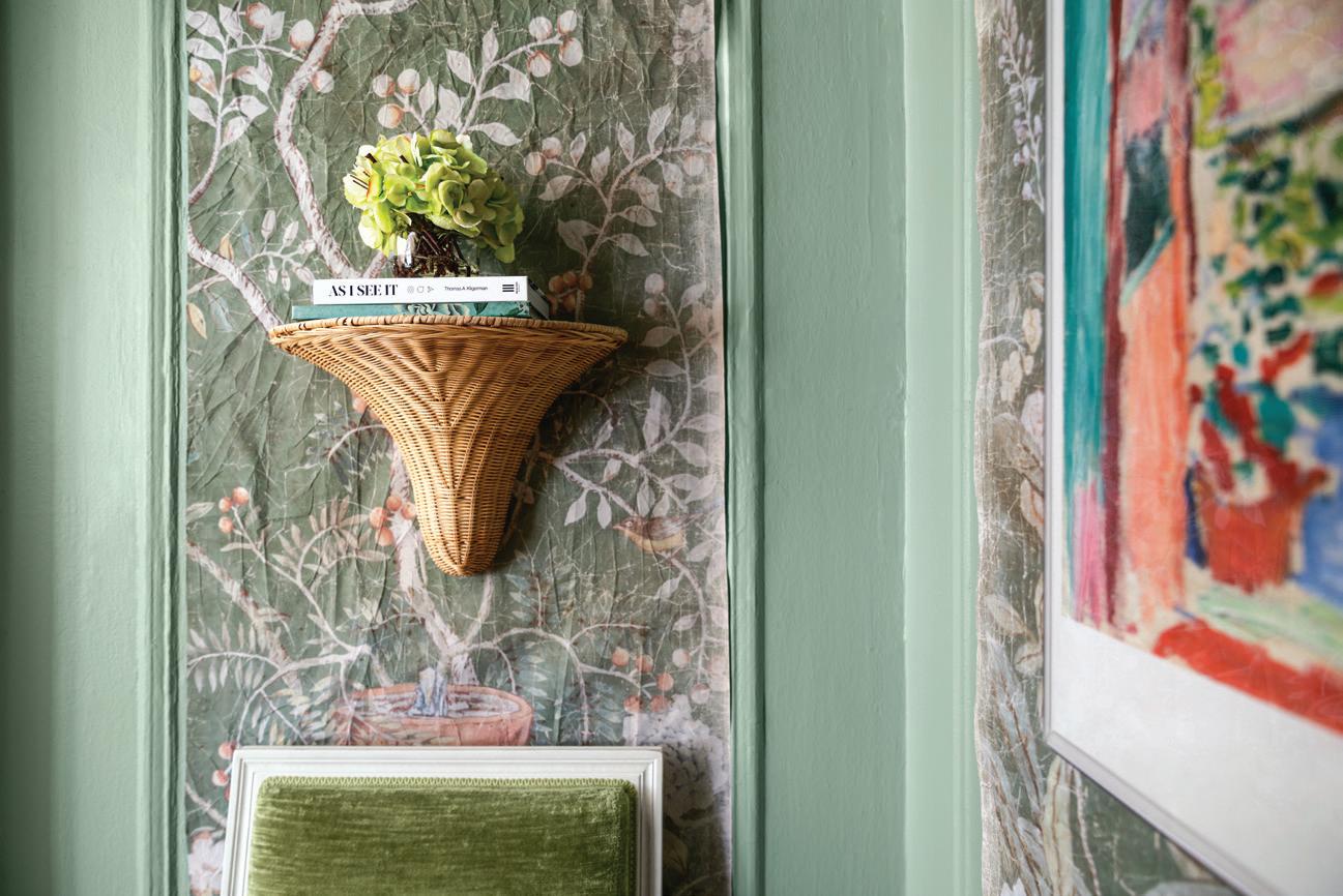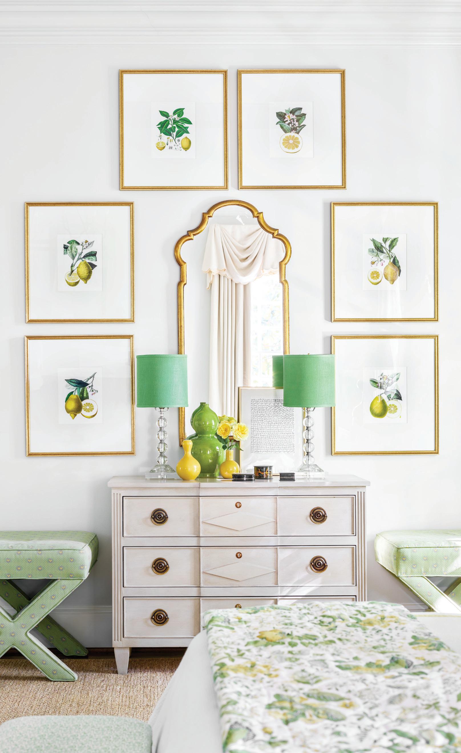 SECOND ACT: PAGES 32-43: Interior designer: Heather Dewberry Stoller, HuffDewberry, huffdewberry.com; ENTRY: Brown velvet on settee: Schumacher, schumacher.com; green velvet on stool: Lee Jofa, kravet.com; DINING ROOM: Wallpaper: Gracie Studio, graciestudio. com; chandelier: Visual Comfort, visualcomfort.com; mirror: Michael S. Smith for Mirror Home, mirrorhome.com;