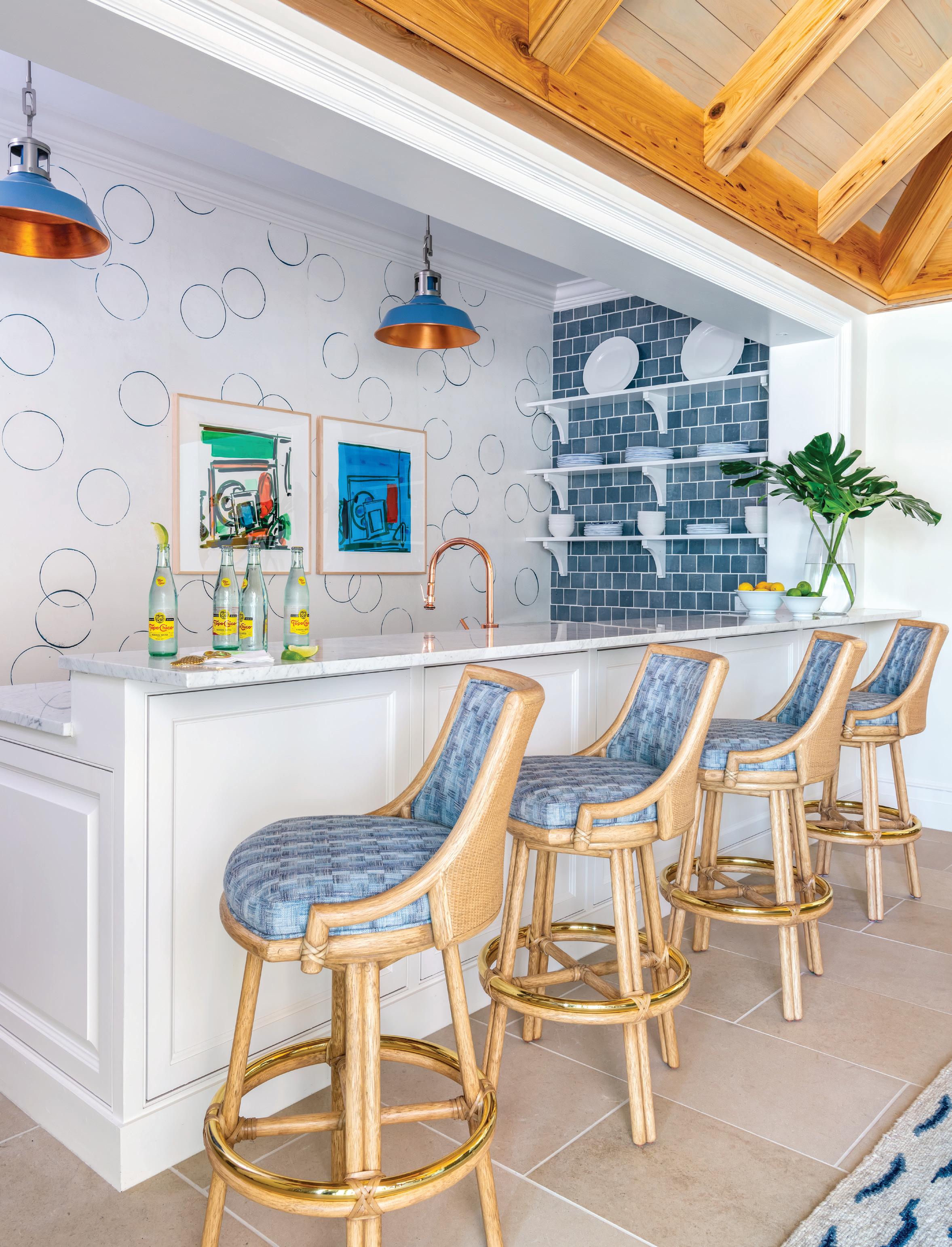 ABOVE: The pool side of the pavilion features a charming eyebrow dormer. All of the outdoor furniture is upholstered in Perennials Fabrics. OPPOSITE: The wallpaper from the pool house bath repeats in the bar for a sense of continuity. A complementary Moroccan tile forms the backsplash with shelves holding dishware at the ready.