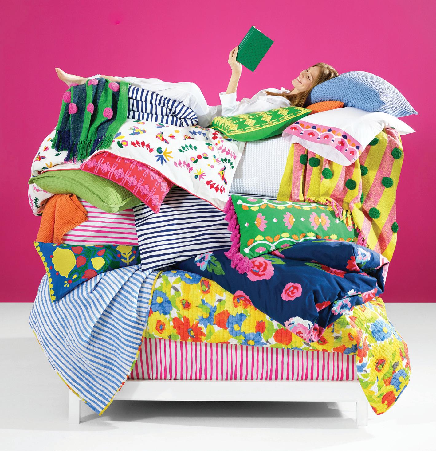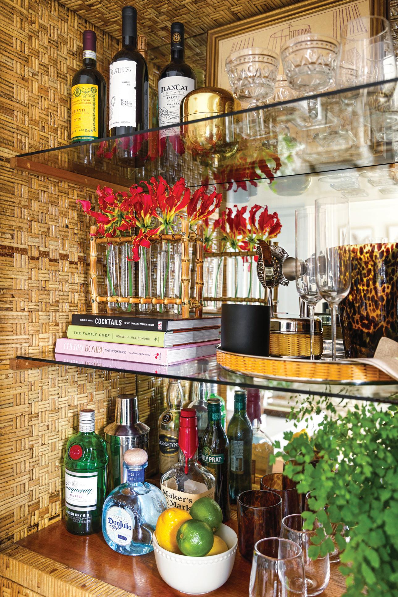 CREATIVE CONFIDENCE: PAGES 4449: Interior designer: Chrissy Ritter, studio-chr.com; stylist: Kimberly Power, kimberlypower.com; LIVING ROOM: Étagères: CB2, cb2.com; grasscloth shade on lamp: Ballard Designs, ballarddesigns. com; book sconces: Kenny Ball Antiques, kennyballantiques.com; tortoise ice bucket in bar: Ballard Designs, ballarddesigns. com; KITCHEN: Peel-and-stick wallpaper: Home Depot, homedepot.com; BEDROOM: Bedding: Amanda Lindroth, amandalindroth.com; duvet: Matouk, matouk.com; bed: Z Gallerie, zgallerie.com; woven lamp: Anthropologie, anthropologie. com; lampshade: Bunny Williams Home, bunnywilliamshome.com; desk: One Kings Lane, onekingslane.com; lampshade on desk lamp: The Shade Store, theshadestore.com