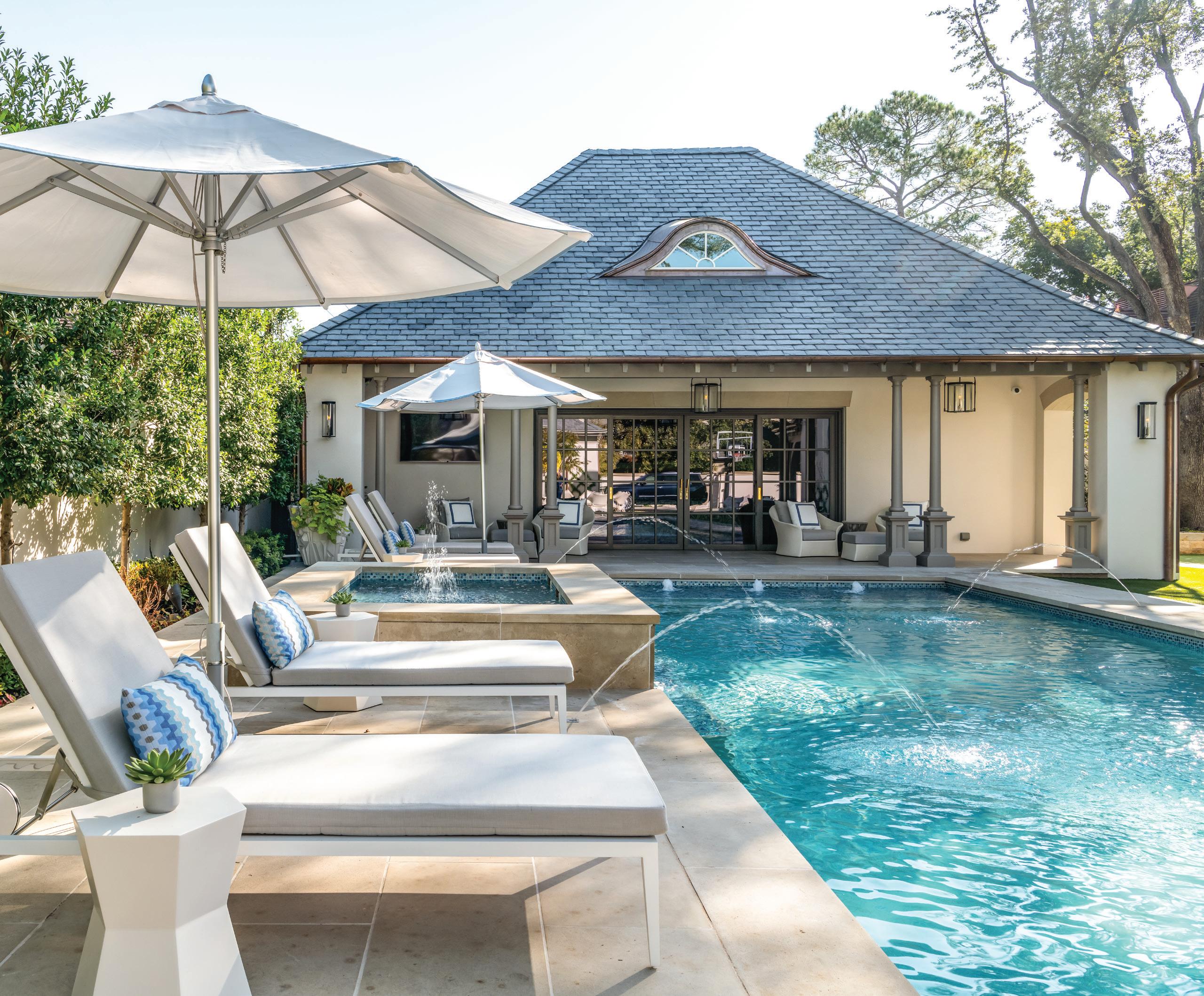 OUTDOOR DINING: Furniture: Janus et Cie, janusetcie.com; POOL: Furniture: Janus et Cie, janusetcie.com; furniture fabric: Perennials, perennials.com; POOL BAR: Art: Matt Connors; barstools: McGuire Furniture, mcguirefurniture.com; wallpaper: Studio E, studioeinc.com; pendant lights: Urban electric, urbanelectric.com