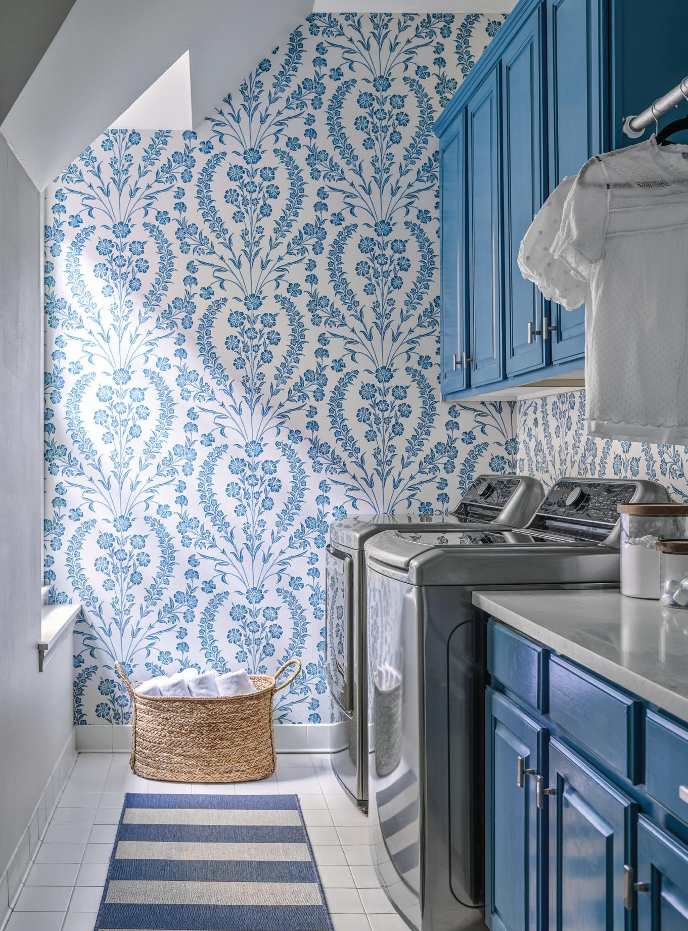 FAMILY ROOM: Paint color: ‘Swiss Coffee’ by Benjamin Moore, benjaminmoore. com; paint on door trim: ‘Wrought Iron’ by Benjamin Moore, benjaminmoore.com; fabric on floral pillows: Nina Campbell, osborneandlittle.com; bargello fabric on center pillow: Brunschwig & Fils, kravet. com; lampshades: Edgar-Reeves, edgarreeves.com; BREAKFAST ROOM: chair fabric: Groves Brothers, grovesbros. com; LAUNDRY ROOM: Wallpaper: Nina Campbell, osborneandlittle.com; cabinetry paint color: ‘Schooner Blue’ by Benjamin Moore, benjaminmoore.com;