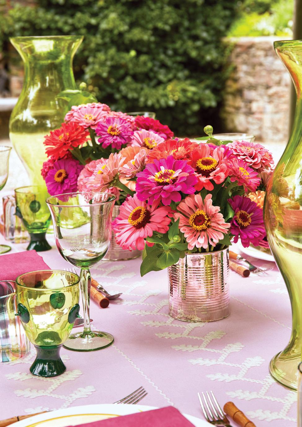 ABOVE: “It’s where everything gets done,” Kate says of the cutting room. Zinc countertops and high-gloss painted wood floors bring elegance and endurance to the hardworking hub. BELOW: Colorful linens and glassware, including Kate’s bespoke handblown hurricanes, adorn the table. Big, bold zinnias are contained in quirky ceramic vases resembling tin cans sourced at Bloom in nearby Sag Harbor.