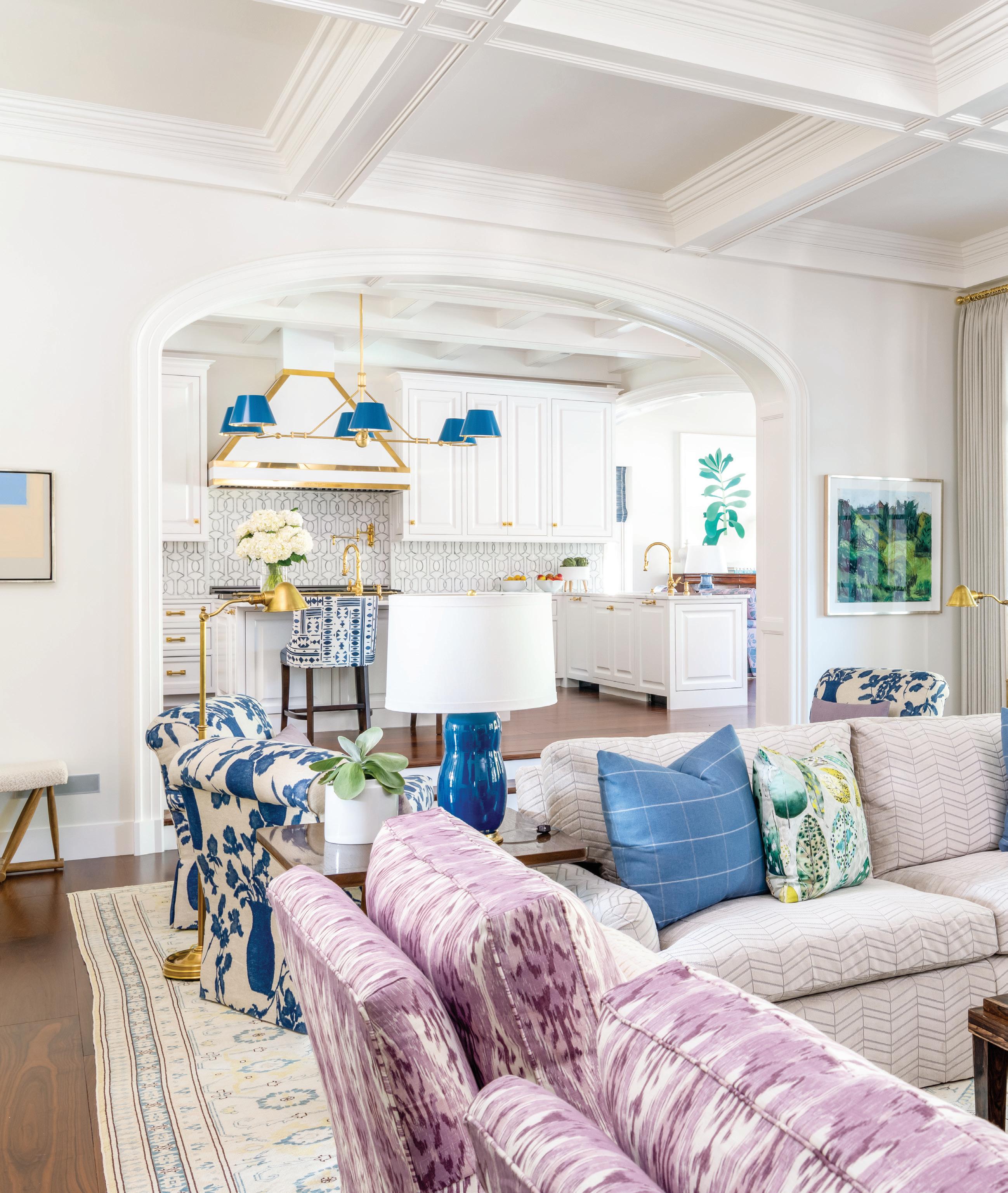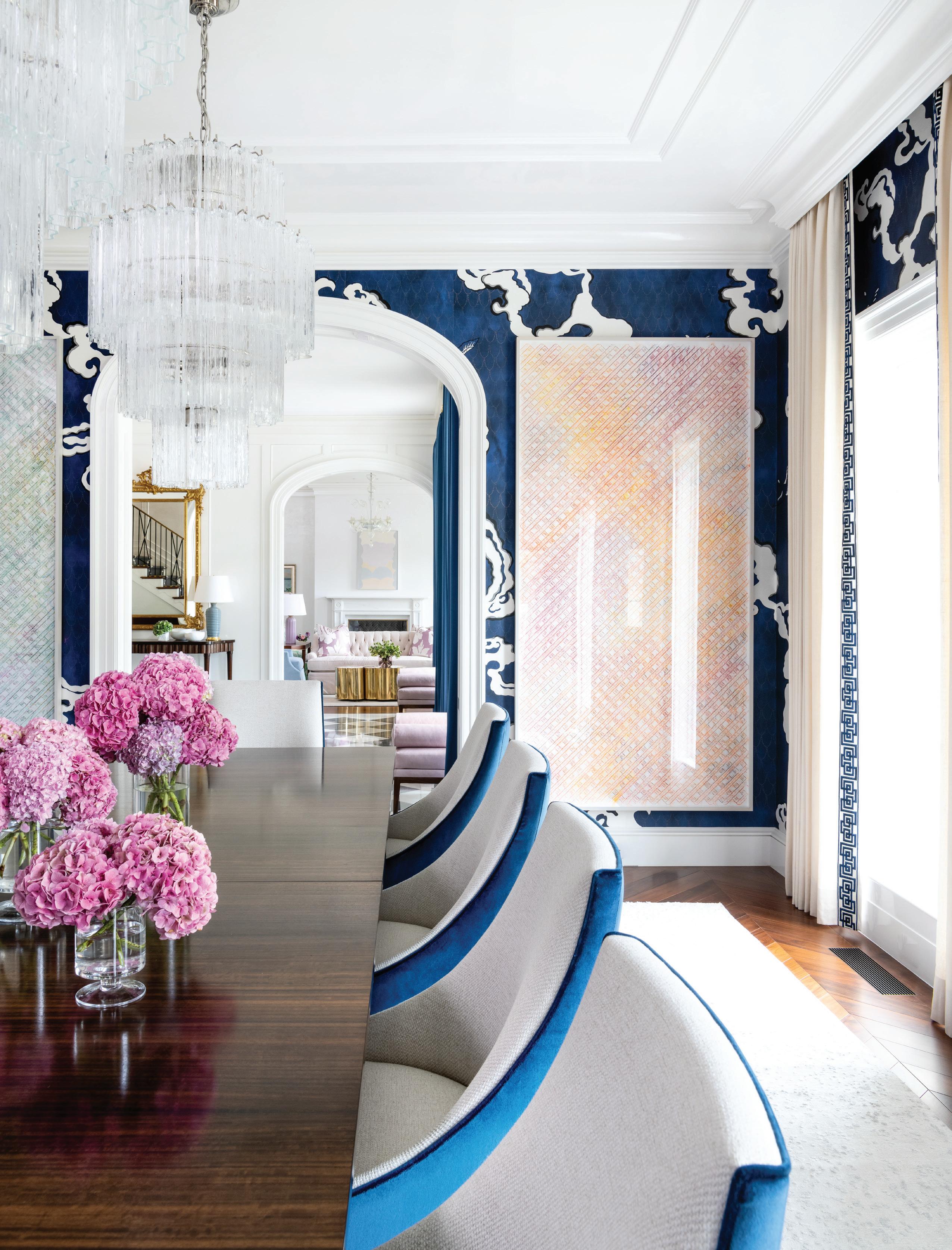 While her client’s favorite color is blue—and there’s plenty of it in the house—Kara also introduced shades of purple and pink, as well as some warm neutrals, to keep it from feeling too monochromatic. And she employed a plethora of wallcoverings—31 in total— to inject liveliness throughout the rooms. “They didn’t want their home to look like any you had seen before, and that is always my goal too,” Kara says. “We worked with niche vendors and artisans and had a lot of things customized to fit the scale of these large rooms.”