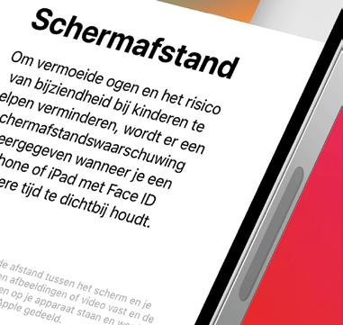 Schermafstand’. Staar je te lang en van te dichtbij naar je scherm, dan krijg je een melding dat de iPhone te dichtbij is. Je moet je iPhone dan op een armlengte afstand houden, en pas als je dat doet, wordt de knop met ‘Ga door’ blauw en kun je weer verder. De iPhone SE mist deze functie.