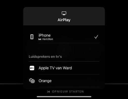 Soms zit AirPlay verstopt. Wil je je foto’s laten zien op het grote scherm? Dan moet je in Foto’s eerst op de deelknop tikken bij een foto (vierkant met pijl naar boven), en dan ‘AirPlay’ selecteren. In YouTube is de functie ook verborgen: daar moet je op de drie radiogolfjes rechtsboven tikken, en ‘AirPlay- en Bluetooth-apparaten’ selecteren. Zelfs bij Spotify moet je even zoeken: AirPlay zit in het speakertje linksonder, bij ‘AirPlay of Bluetooth’.