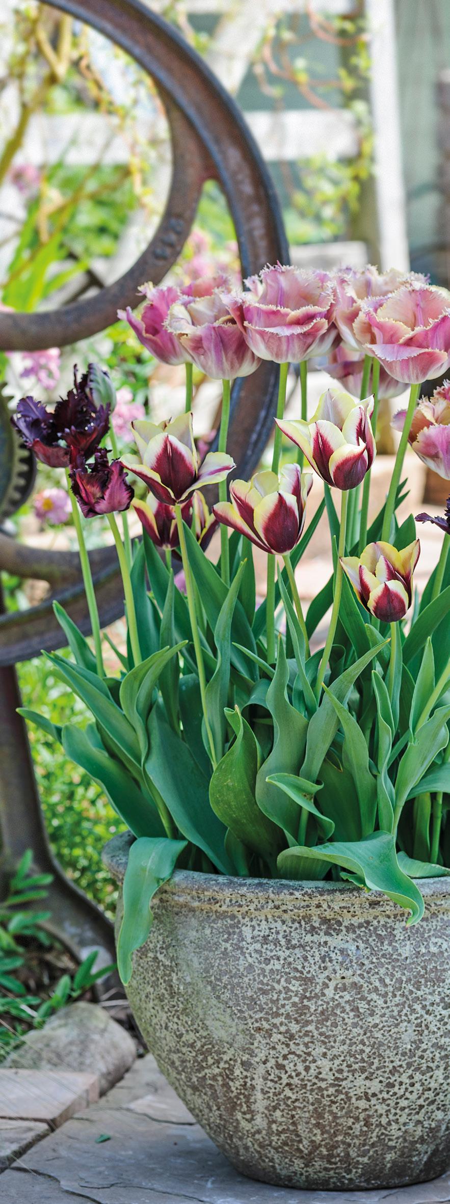 Sunset’ in het midden fascineert door zijn kleurveranderingen. Hij begint met een stralend magenta met oranje randen, wordt dan karamel- en vervolgens abrikooskleurig, waarna hij sierlijk vervaagt tot oudroze en ivoren tinten. De dieppaarse ‘Black Parrot’ op dunne stelen vult zijn buren perfect aan.