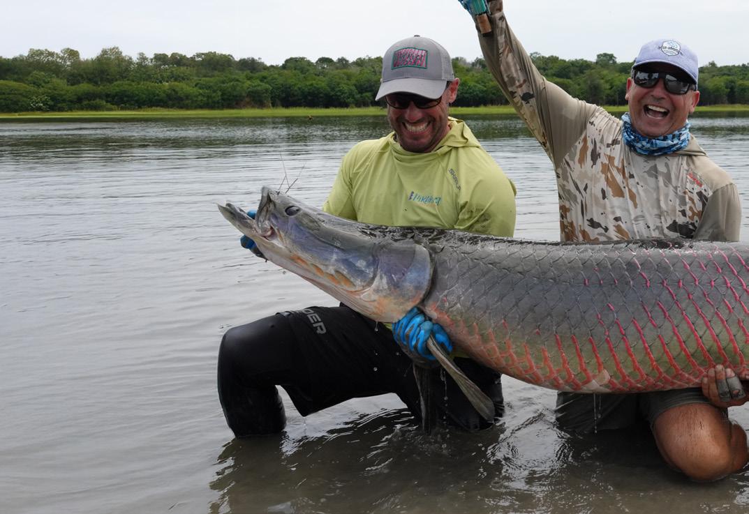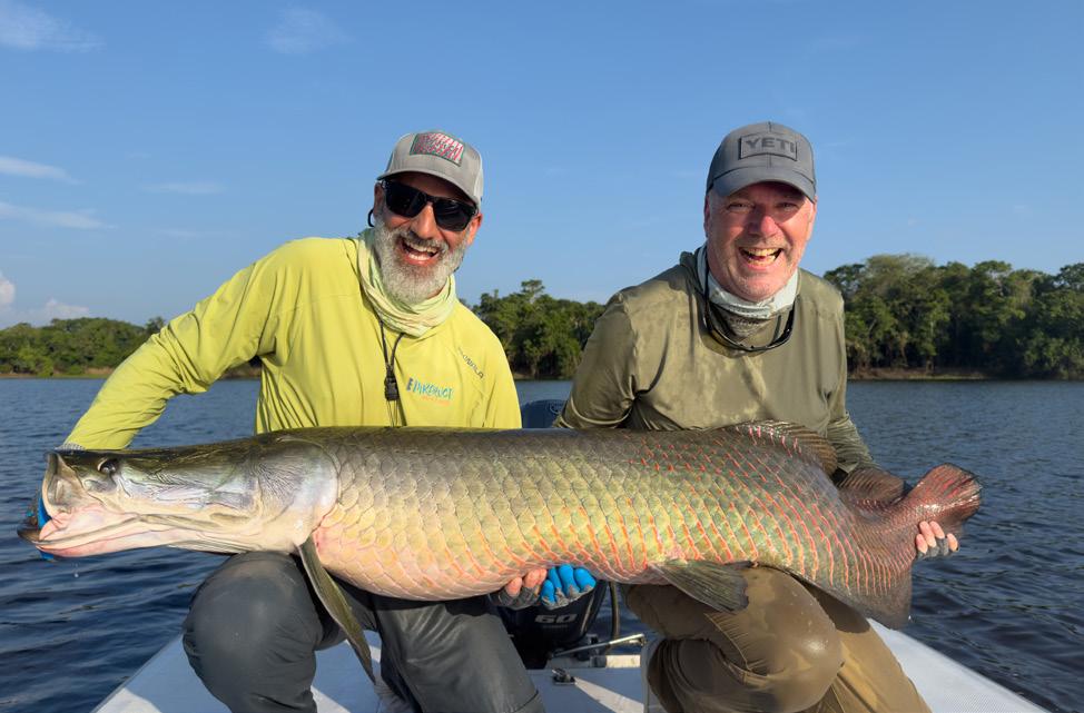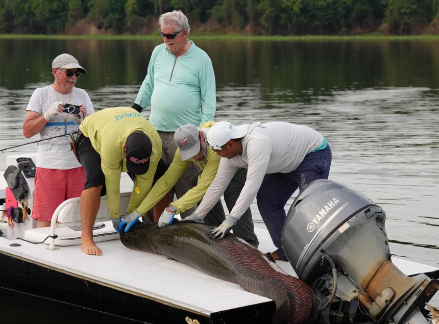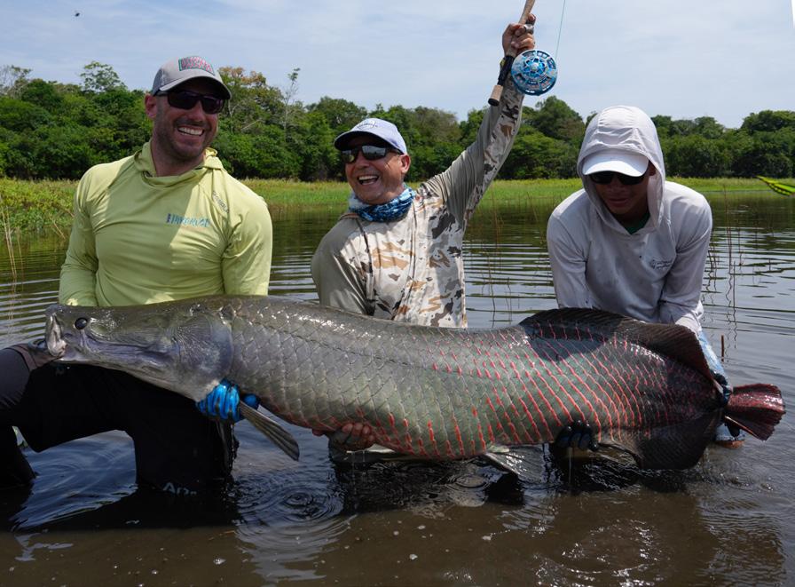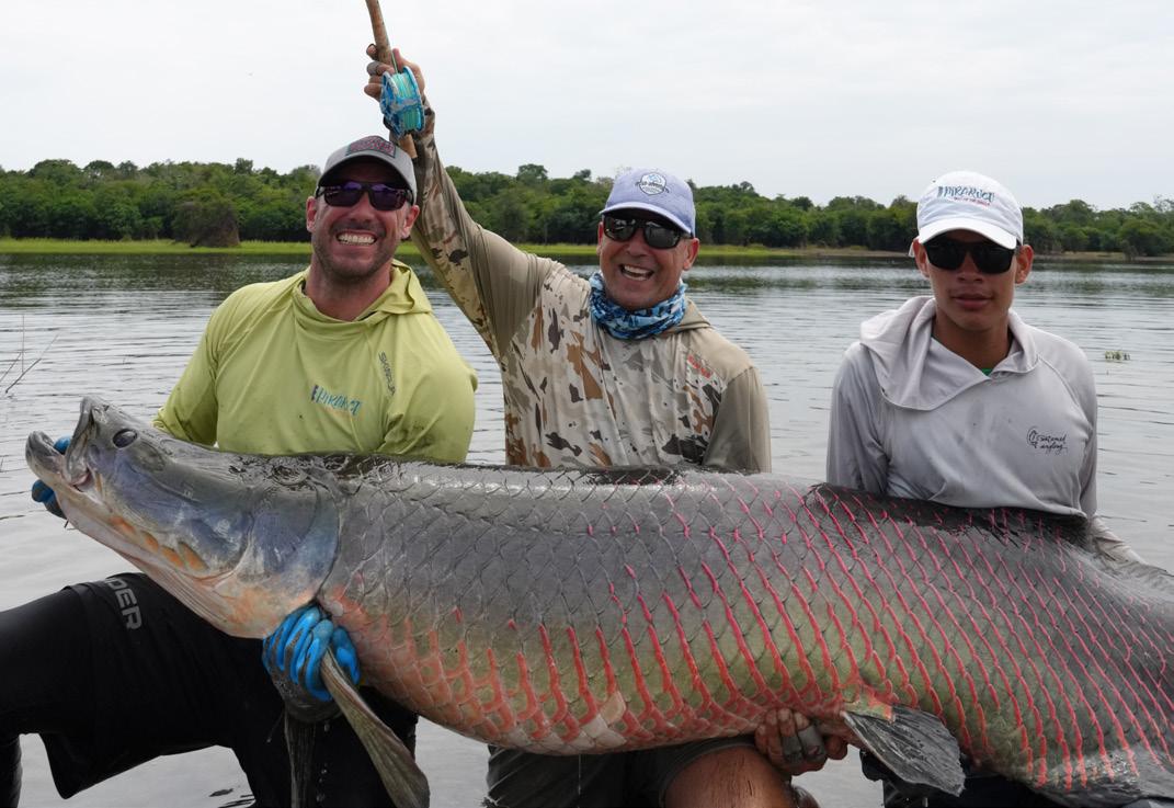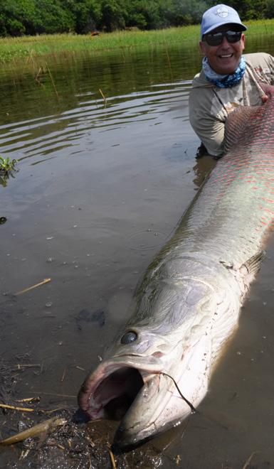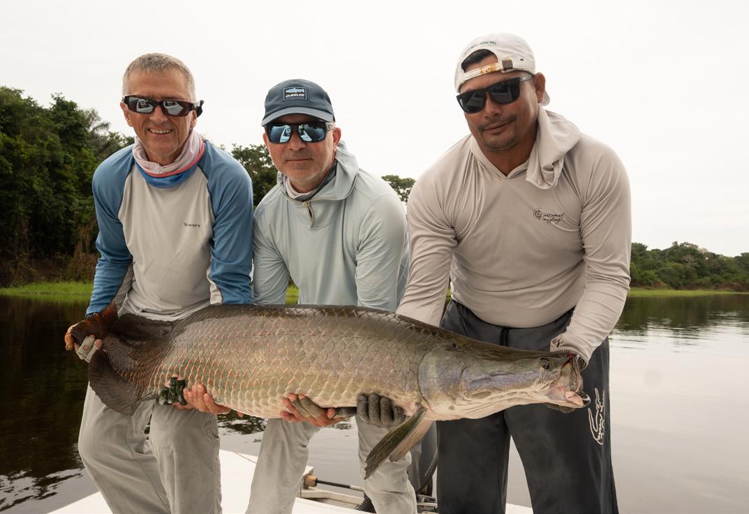 Unsere Gruppe bestand aus erfahrenen und motivierten Fliegenfischern. Entsprechend erfolgreich verlief die Woche. Insgesamt konnten wir 32 Arapaima, 67 Arowana und 12 Tambaqui fangen, darunter mehrere Arapaima über zwei Meter Länge mit einem Spitzenfisch von 225 cm von Christoph, 220 von Marko, 210 von mir und 210 von Heinz. Einige Fische konnten auch knapp unter der 2 Meter marke gefangen werden.
