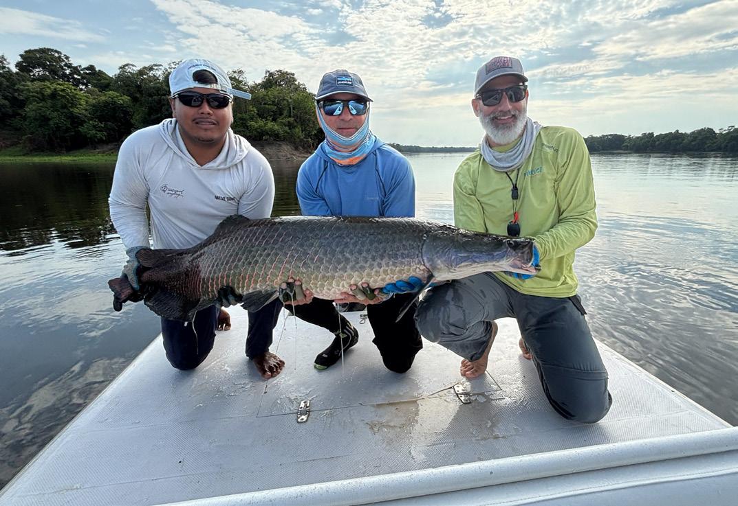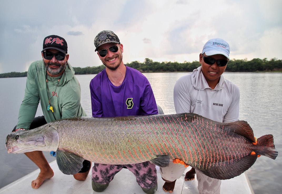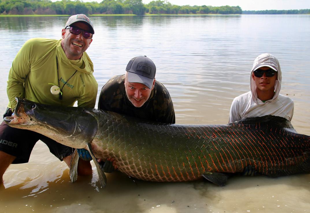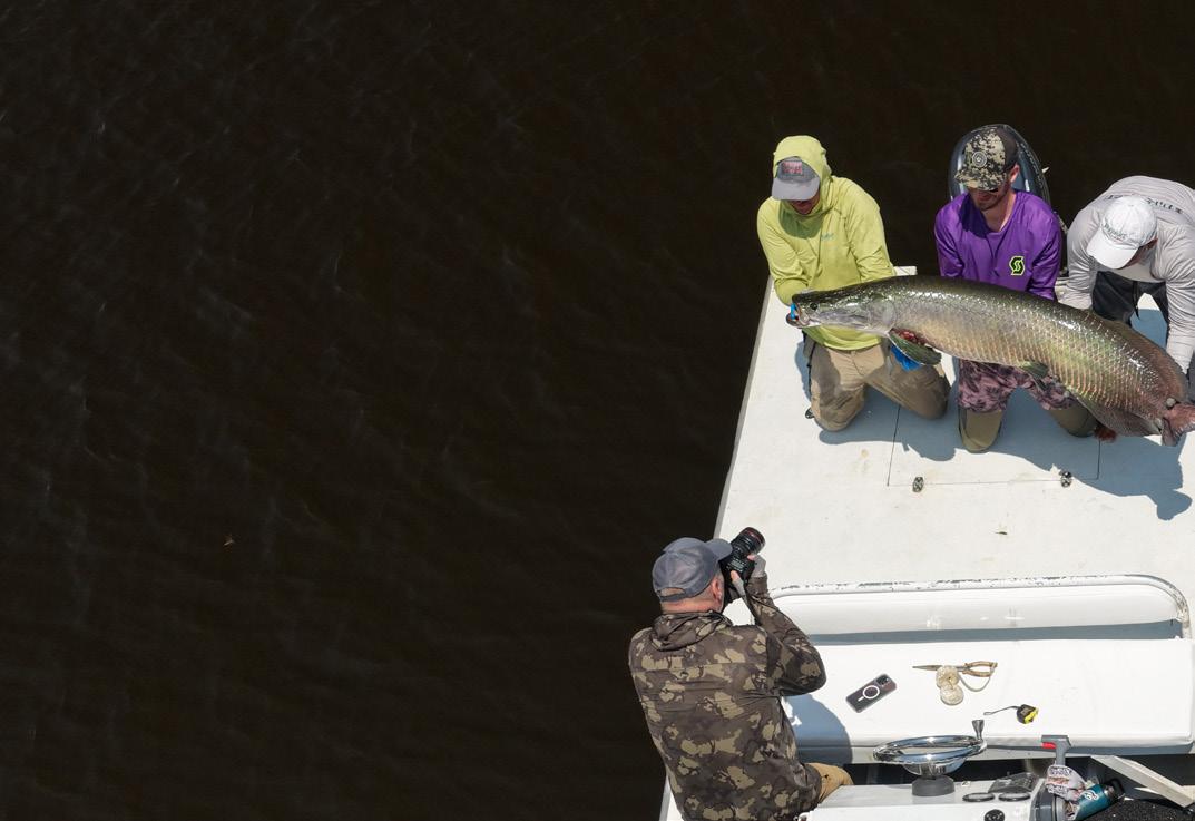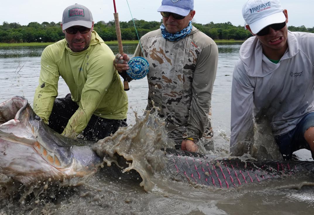 Unsere Gruppe bestand aus erfahrenen und motivierten Fliegenfischern. Entsprechend erfolgreich verlief die Woche. Insgesamt konnten wir 32 Arapaima, 67 Arowana und 12 Tambaqui fangen, darunter mehrere Arapaima über zwei Meter Länge mit einem Spitzenfisch von 225 cm von Christoph, 220 von Marko, 210 von mir und 210 von Heinz. Einige Fische konnten auch knapp unter der 2 Meter marke gefangen werden.