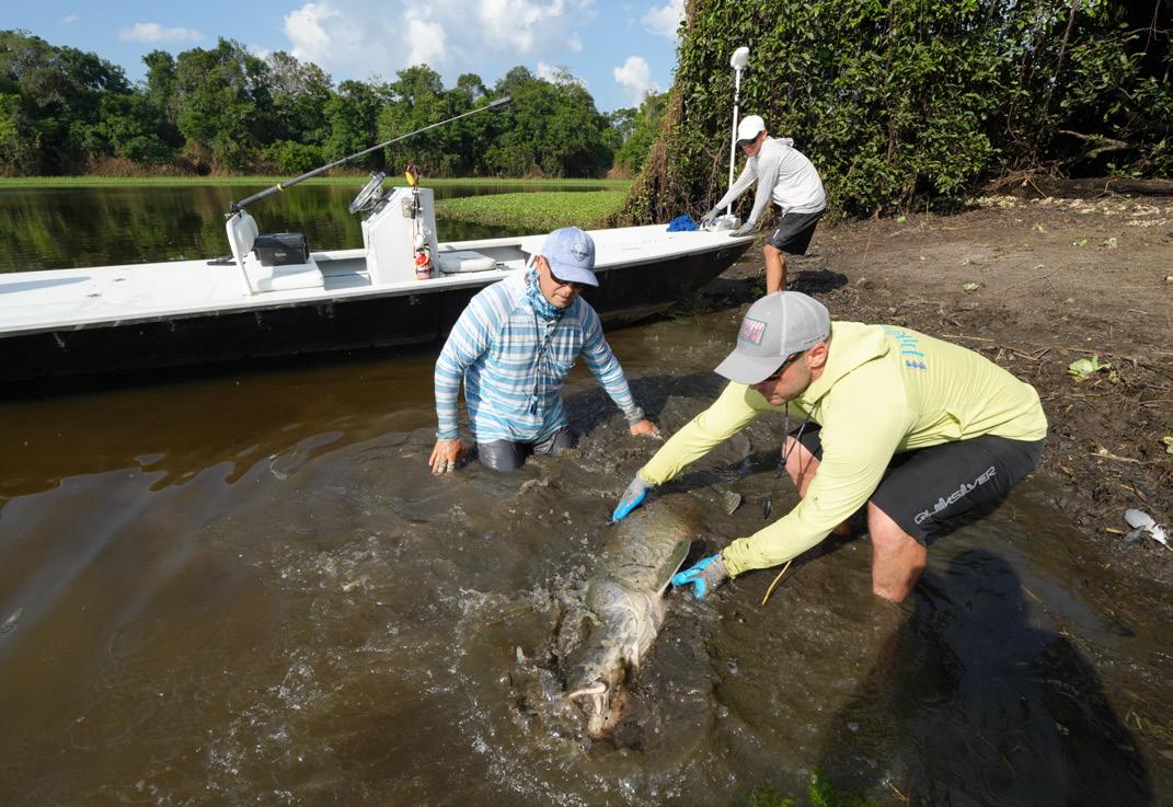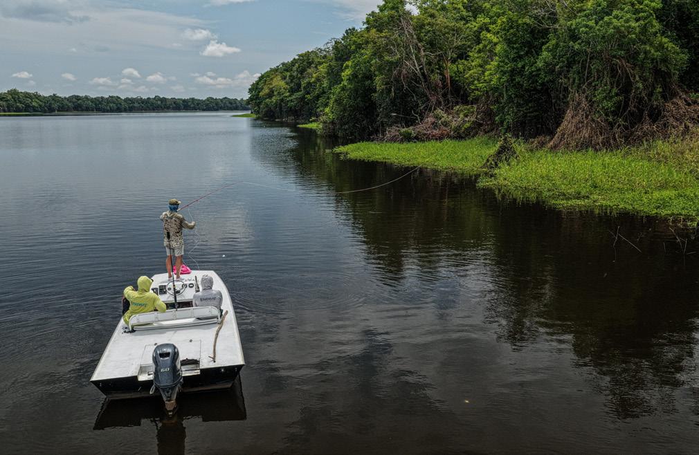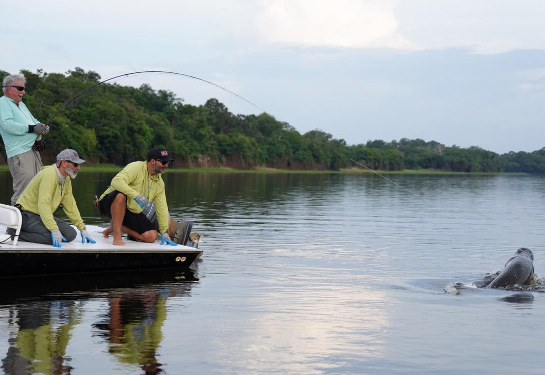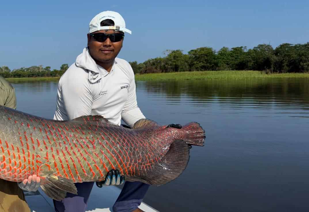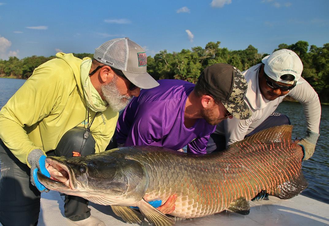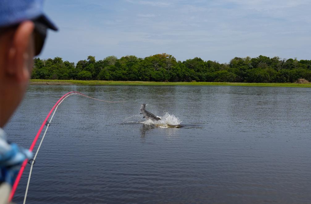 Unsere Gruppe bestand aus erfahrenen und motivierten Fliegenfischern. Entsprechend erfolgreich verlief die Woche. Insgesamt konnten wir 32 Arapaima, 67 Arowana und 12 Tambaqui fangen, darunter mehrere Arapaima über zwei Meter Länge mit einem Spitzenfisch von 225 cm von Christoph, 220 von Marko, 210 von mir und 210 von Heinz. Einige Fische konnten auch knapp unter der 2 Meter marke gefangen werden.