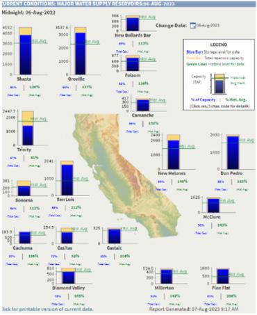 Figure 1 shows statewide reservoir storage levels as of August 6th, 2023 and figure 2 shows current streamflow levels relative to normal for this time of year from the USGS.