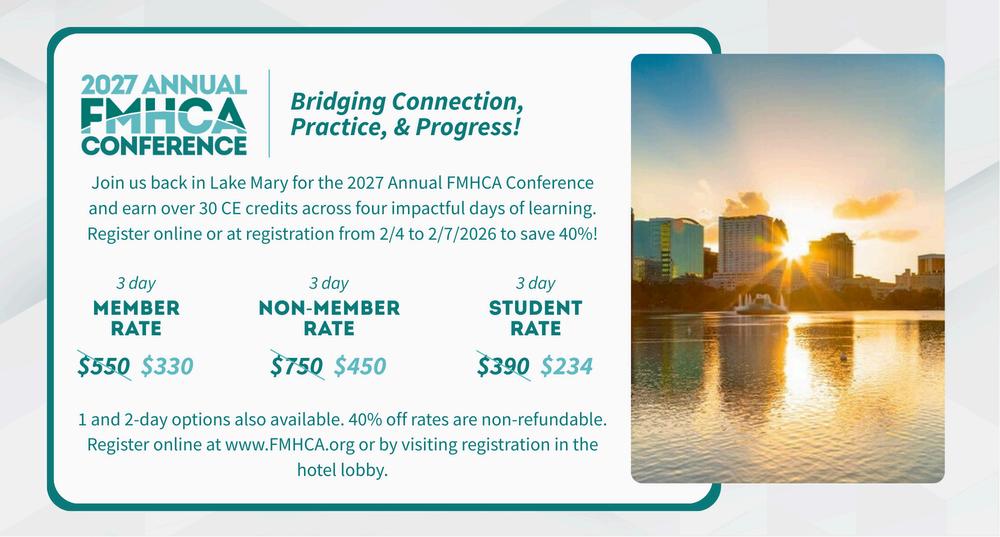 It is with great excitement and deep gratitude that I welcome you to our Annual Conference as I step into the role of President of our professional association representing Licensed Mental Health Counselors across the State of Florida. As a 501(c)(3) nonprofit, our mission has always been rooted in service, advocating for our profession, supporting one another, and ensuring that the communities we serve receive the highest quality of care.