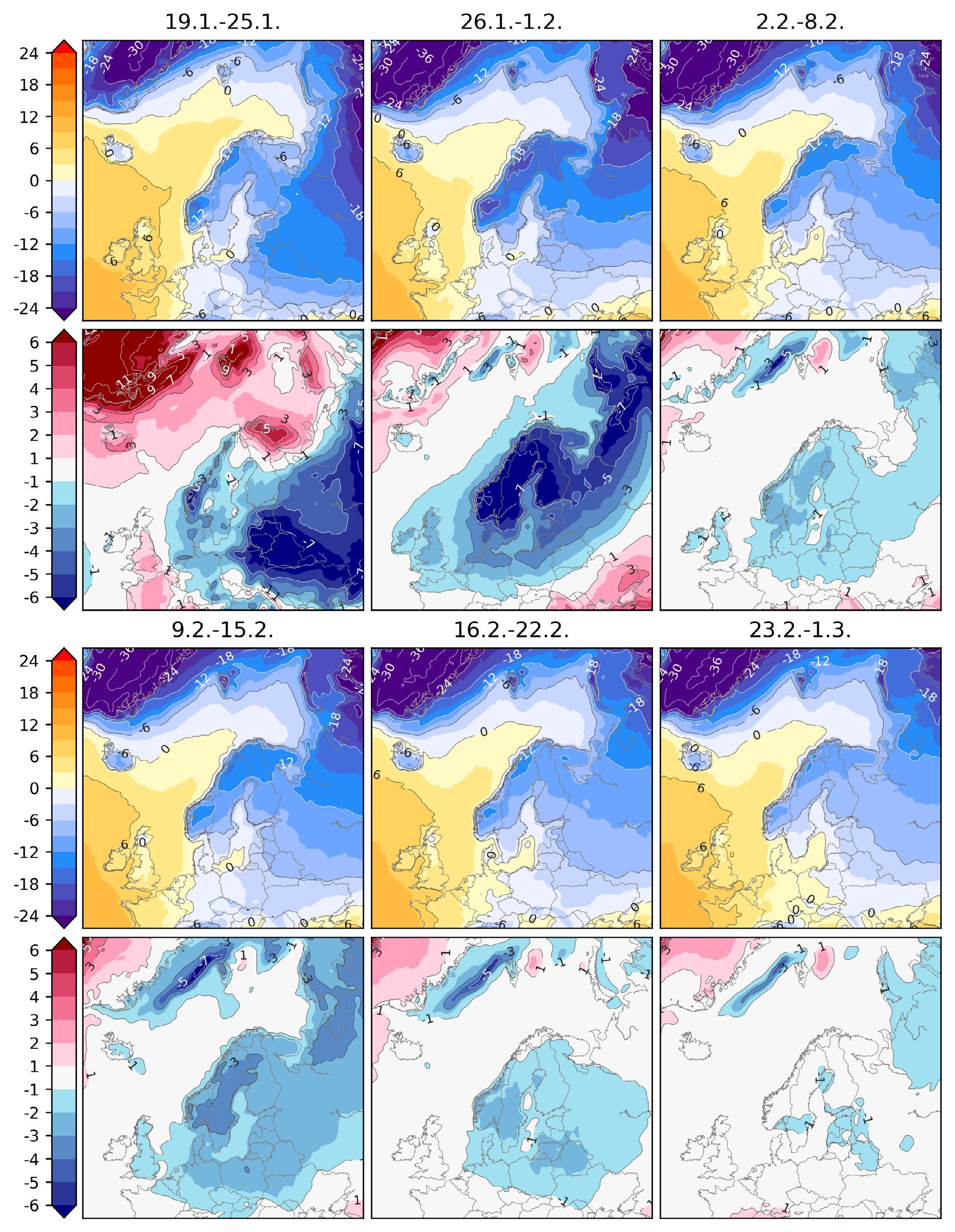 Ennustettu keskimääräinen ilman lämpötila 2 metrin korkeudella (°C) seuraavien kuuden viikon aikana (ylemmät kuvat) ja ennustetun lämpötilan poikkeama (°C) edellisten 20 vuoden keskiarvosta (alemmat kuvat).
