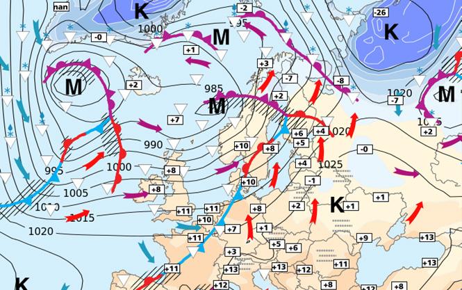 Kuvat ovat Ilmatieteen laitoksen säätilanneanalyysejä ajanhetkiltä 12 UTC eli klo 14 Suomen normaaliaikaa (kesäaikana klo 15).