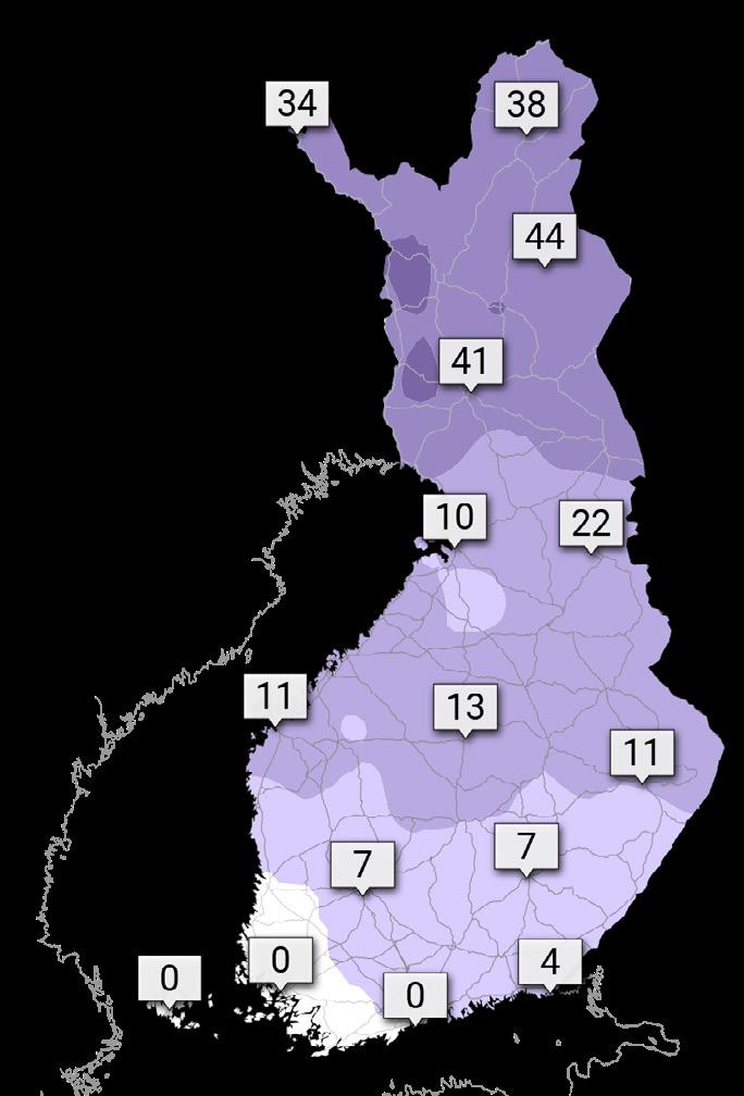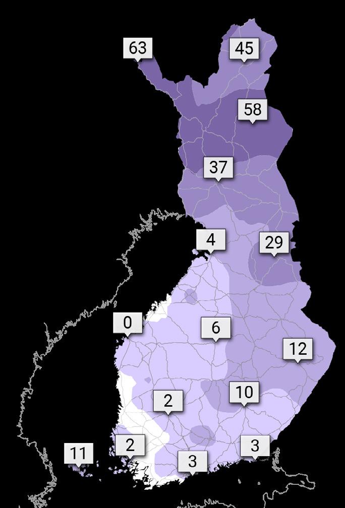 Tuulitilastoissa on käytetty 10-min keskituulta. Tuuliruusuissa käytetyn aineiston havaintoväli on 10 min ja kovatuuliset päivät -taulukossa 1 min. ILMASTOKATSAUS 12/2025 | 19