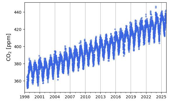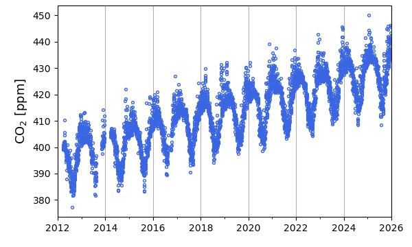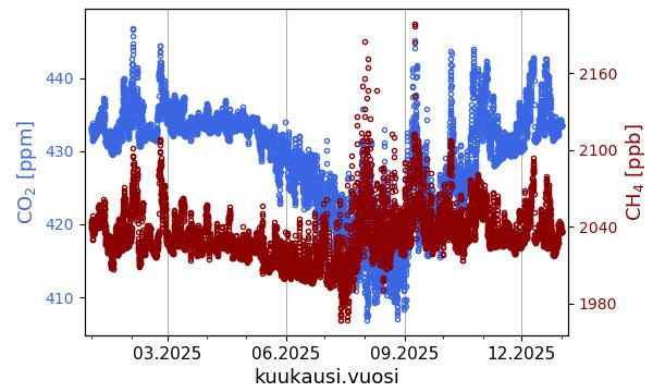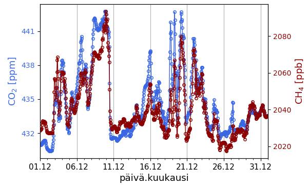 Hiilidioksidi- (CO2) ja metaani- (CH4) pitoisuuksien havaitut tuntikeskiarvot viimeisen kuukauden jaksolla (ylin rivi) sekä viimeisen vuoden jaksolla (keskimmäinen rivi) Pallas-Sammaltunturin ja Utön asemilla. Alarivin kuvissa esitetään hiilidioksidipitoisuuden kehitys useamman vuoden ajalta.