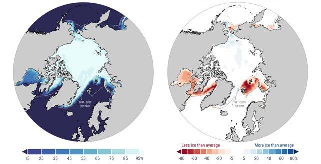 Merijään keskimääräinen peittävyys arktisella alueella joulukuussa 2025 (vas.) ja merijään peittävyyden poikkeama jakson 1991–2020 keskiarvosta (oik.). Katkoviivat kuvaavat jäällisen alueen keskimääräistä rajaa jaksolla 1991–2020, kun jäällisen alueen rajana pidetään jään 15 %:n peittävyyttä.