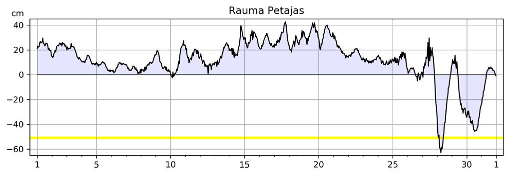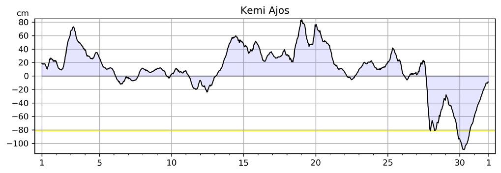 Meriveden korkeus suhteessa teoreettiseen keskivedenkorkeuteen joulukuussa 2025. Kuvaajissa on esitetty mareografeilla tunneittain mitattu keskimääräinen vedenkorkeus. Keltainen vaakaviiva kuvaa matalan vedenkorkeuden varoitusrajaa.