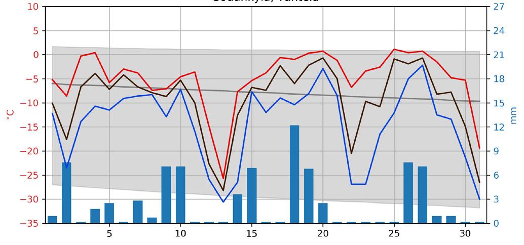 Joulukuussa 2025 päivittäin mitattu vuorokauden keskilämpötila (°C, musta käyrä), ylin lämpötila (°C, punainen käyrä) ja alin lämpötila (°C, sininen käyrä) sekä vuorokauden sademäärä (mm, siniset pylväät). Lämpötilan tasoitetut vertailuarvot ovat kaudelta 1991–2020. Harmaa käyrä kuvaa vuorokauden keskilämpötilan 50 %:n arvoa eli mediaania, ja harmaa varjostus kuvaa aluetta, jonka sisällä noin 97 % vuorokauden keskilämpötiloista tilastollisesti esiintyy.