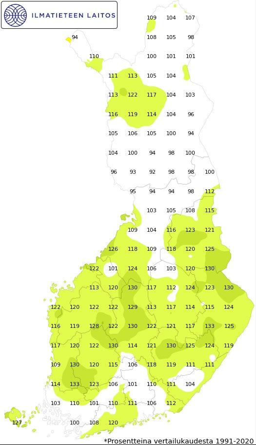 SADEMÄÄRÄ PROSENTTEINA VERTAILUKAUDESTA 1991–2020