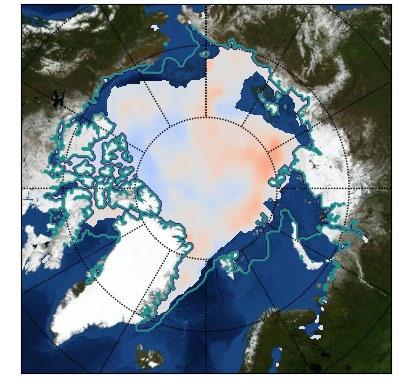Kuva 12: Arktisen merijään paksuuden poikkeama 18.10.2023 vuosien 2011–2022 ajankohdan keskiarvosta. Turkoosi viiva kuvaa ajankohdan suurinta merijään laajuutta tarkastelujaksolla. Data: IL ja AWI