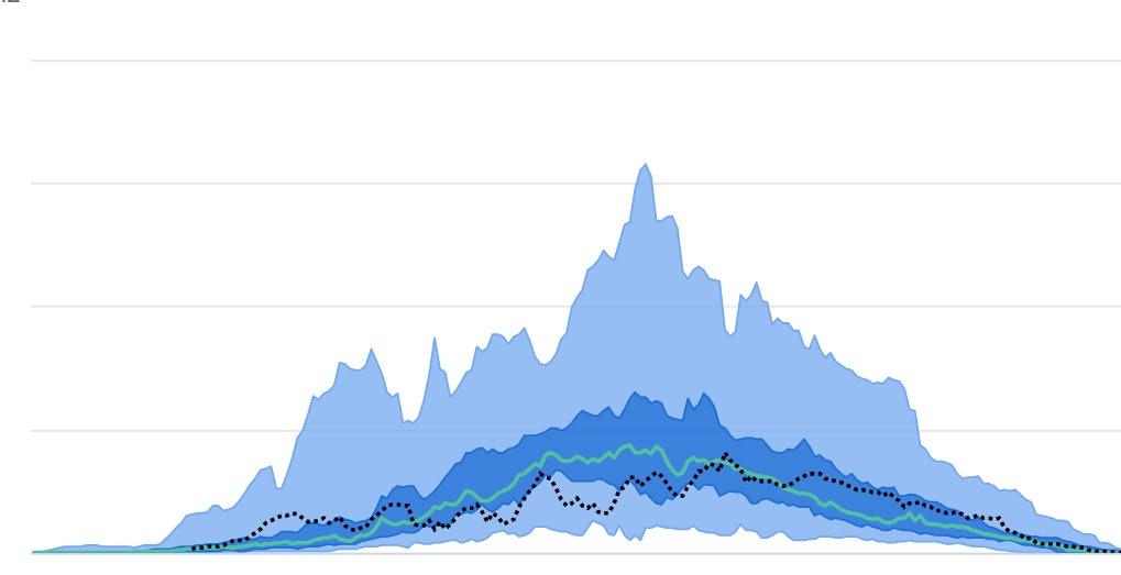 Kuva 8: Itämeren jääpeitteen laajuus talvella 2022–2023 (musta pistekäyrä) verrattuna vuosien 2007–2022 mediaanilaajuuteen (vihreä käyrä). Vaaleansininen varjostus esittää jääpeitteen laajuuden koko vaihteluvälin vuosina 2007–2022. Tummansininen varjostus kuvaa laajuuden tavanomaisinta vaihteluväliä, jonka sisälle puolet havaituista jääpeitteen laajuuksista asettuu (prosenttipisteet 25–75 %).