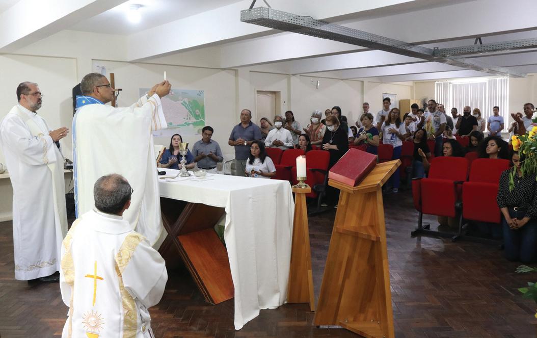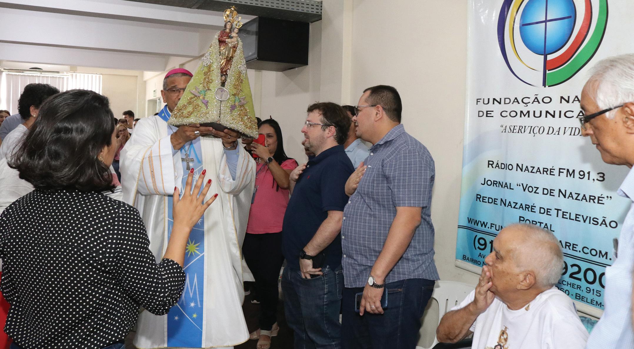 ASanta Missa reuniu os colaboradores da Cúria Metropolitana de Belém e da Fundação Nazaré de Comunicação no dia 5 para aguardar a visita da imagem Peregrina de Nossa Senhora de Nazaré, dentro da programação que antecede o Círio de Nossa Senhora de Nazaré no próximo domingo, 9. A celebração eucarística foi presidida por Dom Antônio Ribeiro de Assis, Bispo Auxiliar da Arquidiocese, concelebrada pelo côn. Roberto Cavalli, assistidos pelo diácono Raimundo Nonato Santos. O Arcebispo Metropolitano de Belém, Dom Alberto Taveira Corrêa a saudação aos fiéis à chegada imagem.