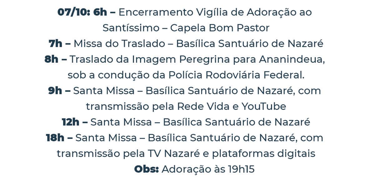 Dia 12, festa solene de Nossa senhora de Aparecida, a programação começa com Missa às 7h, transmitida ao vivo pela Rádio Nazaré FM.