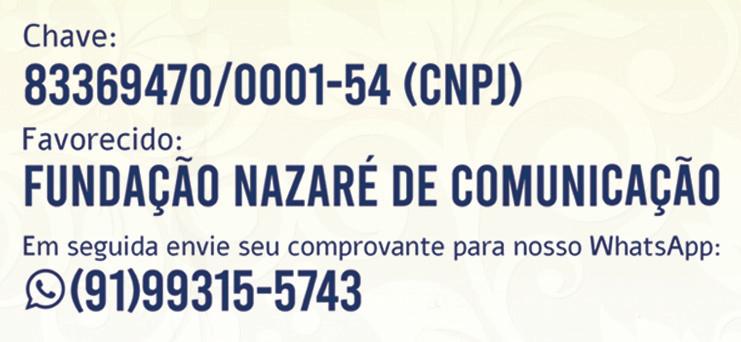 2 OPINIÃOBELÉM, DE 7 A 13 DE OUTUBRO DE 2022 Fundado em 5 de julho de 1913 FUNDADOR Pe. Florence Dubois, barnabita PRESIDENTE Dom Alberto Taveira Corrêa Arcebispo Metropolitano de Belém do Pará VICE-PRESIDENTE Dom Antônio de Assis Ribeiro Bispo Auxiliar da Arquidiocese de Belém do Pará DIRETOR GERAL Cônego Roberto Emílio Cavalli Junior DIRETOR ADMINISTRATIVO E FINANCEIRO Marcos Aurélio de Oliveira DIRETOR DE COMUNICAÇÃO Mário Jorge Alves da Silva DIRETOR DE CAPTAÇÃO DE RECURSOS Alan Monteiro da Silva COORDENAÇÃO Bernadete Costa (DRT 1326) CONSELHO DE PROGRAMAÇÃO E EDITORAÇÃO Cônego Roberto Emílio Cavalli Junior - Presidente DIAGRAMAÇÃO Greison Dias Carvalho Assinaturas, distribuição, administração e redação Av. Gov. José Malcher, Ed. Paulo VI, 915 CEP: 66055-260 ARQUIDIOCESE DE BELÉM-PARÁ - Nazaré, Belém - PA Tel.: (91) 4006-9200/ 4006-9209. Fax: (91) 4006-9227 Redação: (91) 4006-9200/ 4006-9238/ 4006-9239/ 4006-9244/ 4006-9245 Site: www.fundacaonazare.com.br E-mail: voz@fundacaonazare.com.br Um veículo da Fundação Nazaré de Comunicação CNPJ nº 83.369.470/0001-54 Impresso no parque gráfico de O Liberal FUNDAÇÃO NAZARÉ DE COMUNICAÇÃO PE. HELIO FRONCZAK ASSIM NA TERRA COMO NO CÉU ... heliofronczak@gmail.com