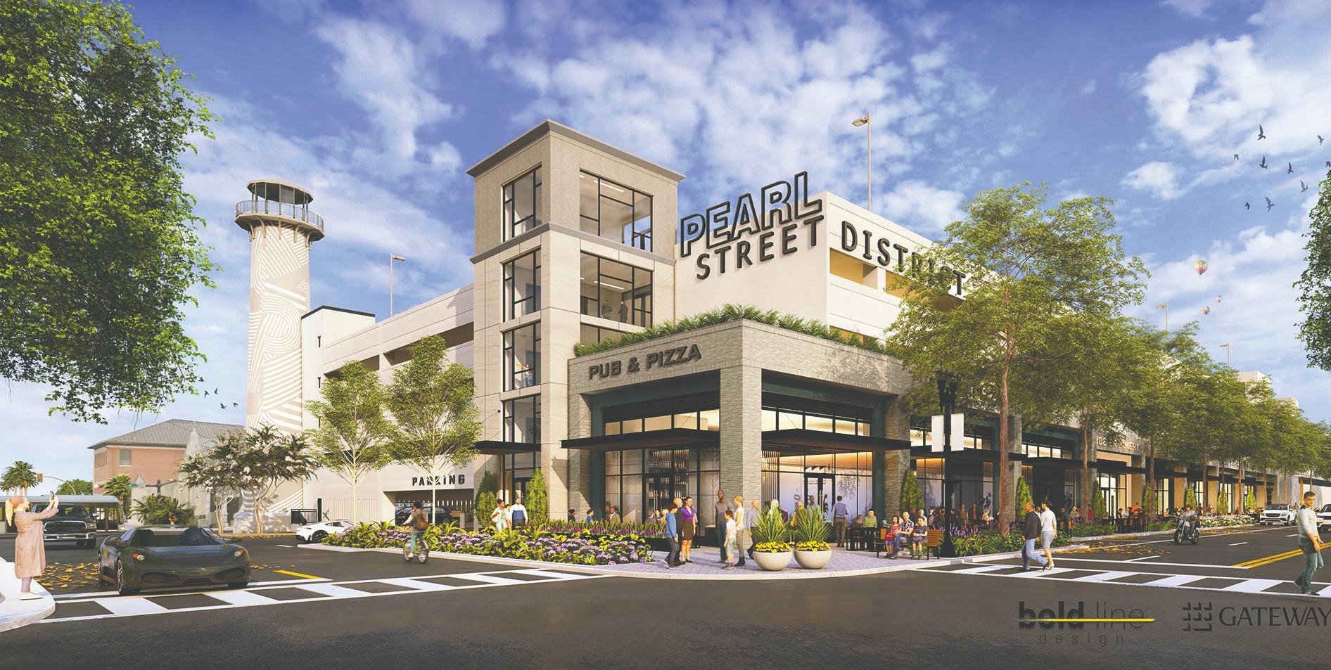 A rendering shows the 1.5acre block branded Pearl Street District. A placeholder name shows “pub & pizza” as a type of tenant.