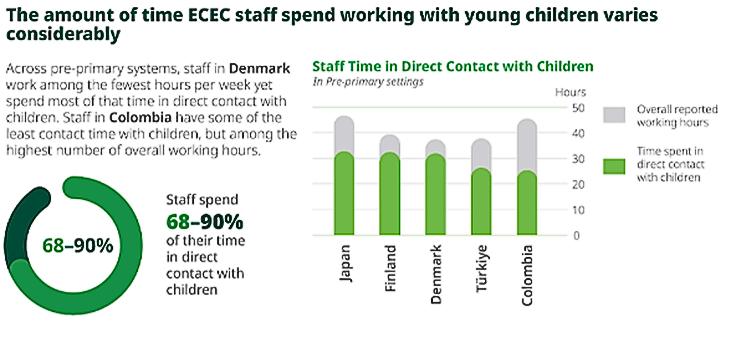 Os educadores de infância passam a maior parte do tempo em contacto direto com as crianças, embora isso varie muito entre os participantes do inquérito de 68% na Colômbia a 90% na Dinamarca. Notavelmente, se os profissionais trabalham mais horas, isso não significa necessariamente que passam mais tempo com as crianças