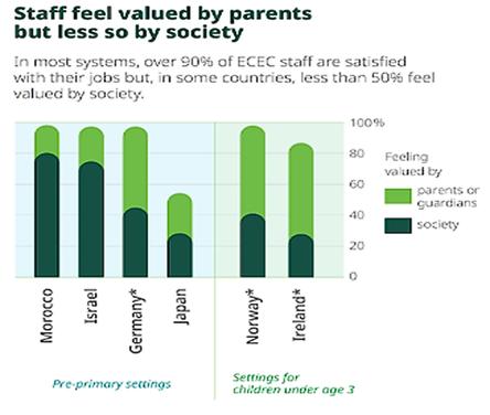 O reconhecimento social percebido é frequentemente maior entre os funcionários da ECEC em comparação com os profissionais que trabalham em outros níveis de educação. A percentagem de valorização pela sociedade varia entre os sistemas, oscilando entre 24% da pré-escola na Noruega e 88% na Colômbia.