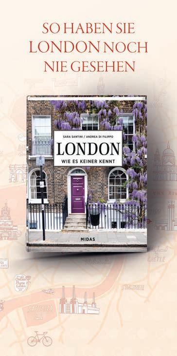 Liebe Freunde des Midas Verlags, Eine der schönsten Aufgaben von Büchern ist es, den Leserinnen und Lesern einen unerwarteten Einblick in etwas zu geben, das sie eigentlich zu kennen glaubten. Da uns dies im letzten Jahr mit dem überaus erfolgreichen »NEW YORK«-Buch von Susan Kaufman offensichtlich gelungen ist, folgt im Frühling 23 der Nachfolger »LONDON«. Auch diesmal wird eine Stadt vorgestellt, die fast alle schon als Tourist besucht, aber eben vielleicht doch nicht so gesehen haben wie Sara Santini und Andrea di Filippo. Eine neue Sichtweise auf die Kunst vermi elt »ROSA«, in dem die Geschichte einer Farbe in 40 Werken präsentiert wird. Ganz besonders stolz sind wir auf »Afrika in Mode«, denn dieses Buch vereint Kompetenz (der Texte) und Opulenz (der Bilder) auf hervorragende Weise. Dasselbe gilt für »Street Art von Frauen«, in dem 50 Künstlerinnen im O-Ton zu Wort und Bild kommen. »Street Art in Zeiten der Klimakrise« ist ein kämpferischer Protest gegen die nach wie vor ungelösten Probleme beim Klimaschutz, und auch der Urvater der Street Art ist mit »BANKSY - Provokation« in der mi lerweile