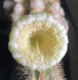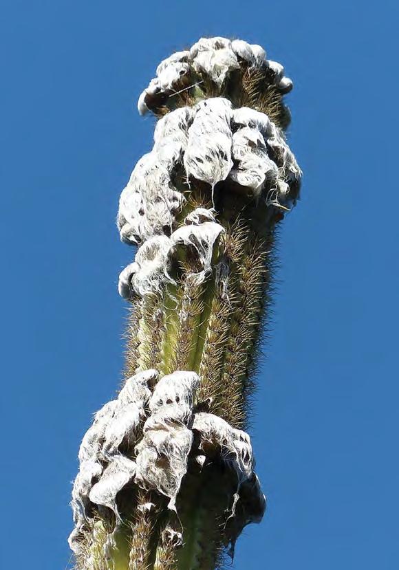 Facing page, clockwise from upper left: The Key Largo tree cactus can grow to impressive heights. Before blooming, the cactus produces thick tufts of matted white hairs, possibly as a means of protecting the developing flower from the sun. After the flower has bloomed and died, the fruits ripen and develop a reddish-purple exterior that attracts birds and mammals. The large white flowers have a mild scent reminiscent of garlic and reflective white petals and reproductive tissue that helps pollinators find them by moonlight. Photos by Susan Kolterman.