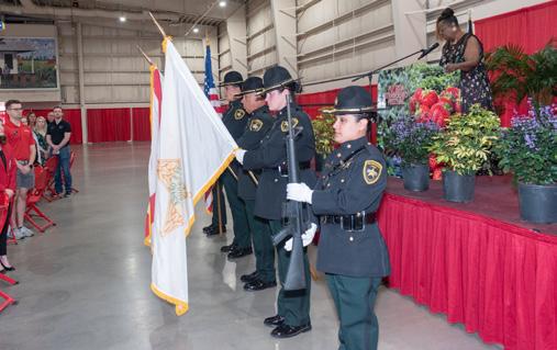 d. The Hillsborough County Sheriffs Office Color Guard presented the colors as Gwendolyn Honors (far right) sang the National Anthem to open the luncheon’s program.