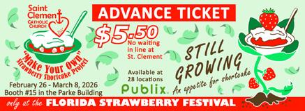 Cost: $15 at gate; $10 at Publix Supermarkets Info: flstrawberryfestival.com