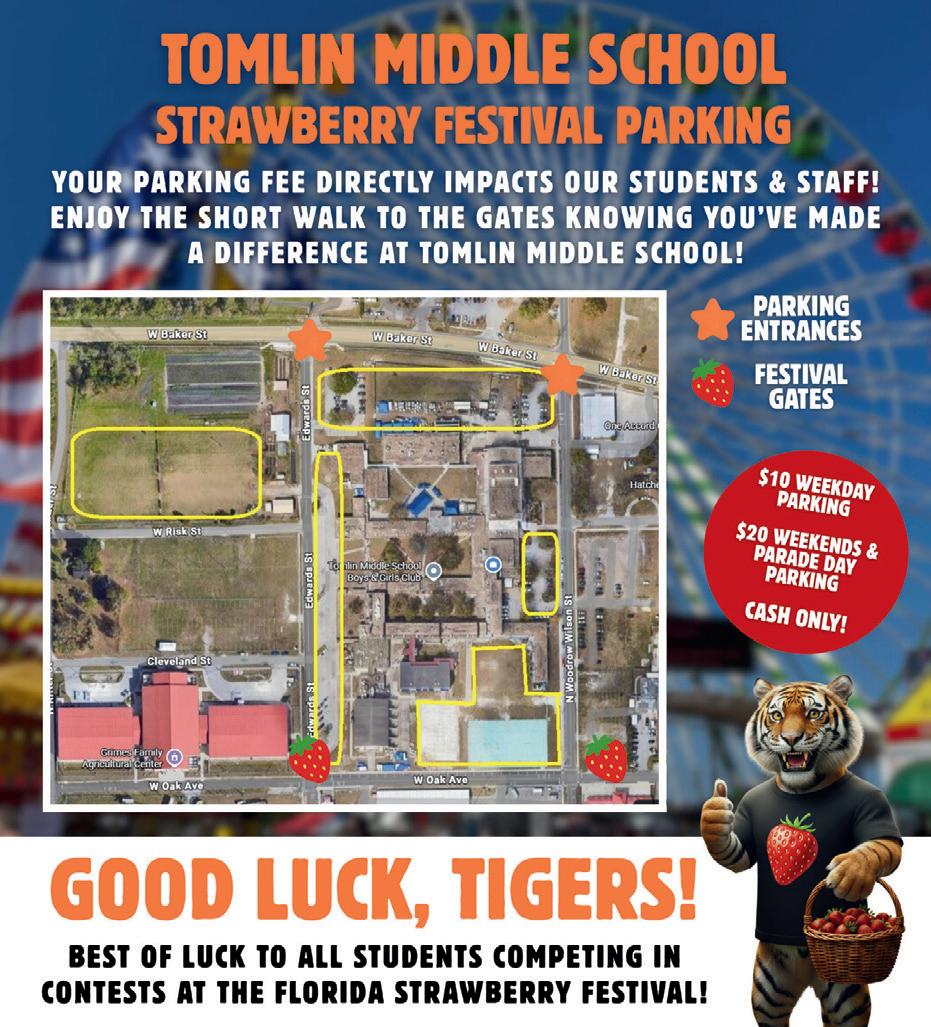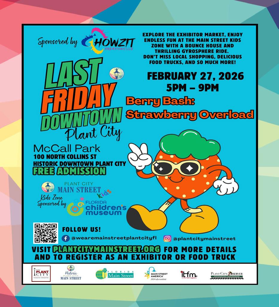 The Strawberry Grand Parade will be held on Monday, March 2, 2026, at 1:00 p.m. The parade will travel north on Evers Street, then turn left onto Reynolds Street, passing the Florida Strawberry Festival at 2:00 p.m.