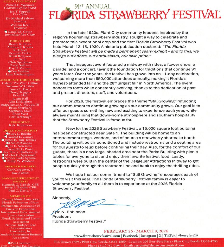 This issue is all about celebrating our growers, our traditions, our food, and our hometown pride. The Florida Strawberry Festival is more than an event; it’s a reminder of who we are and where we come from—and why this community is worth celebrating year after year.