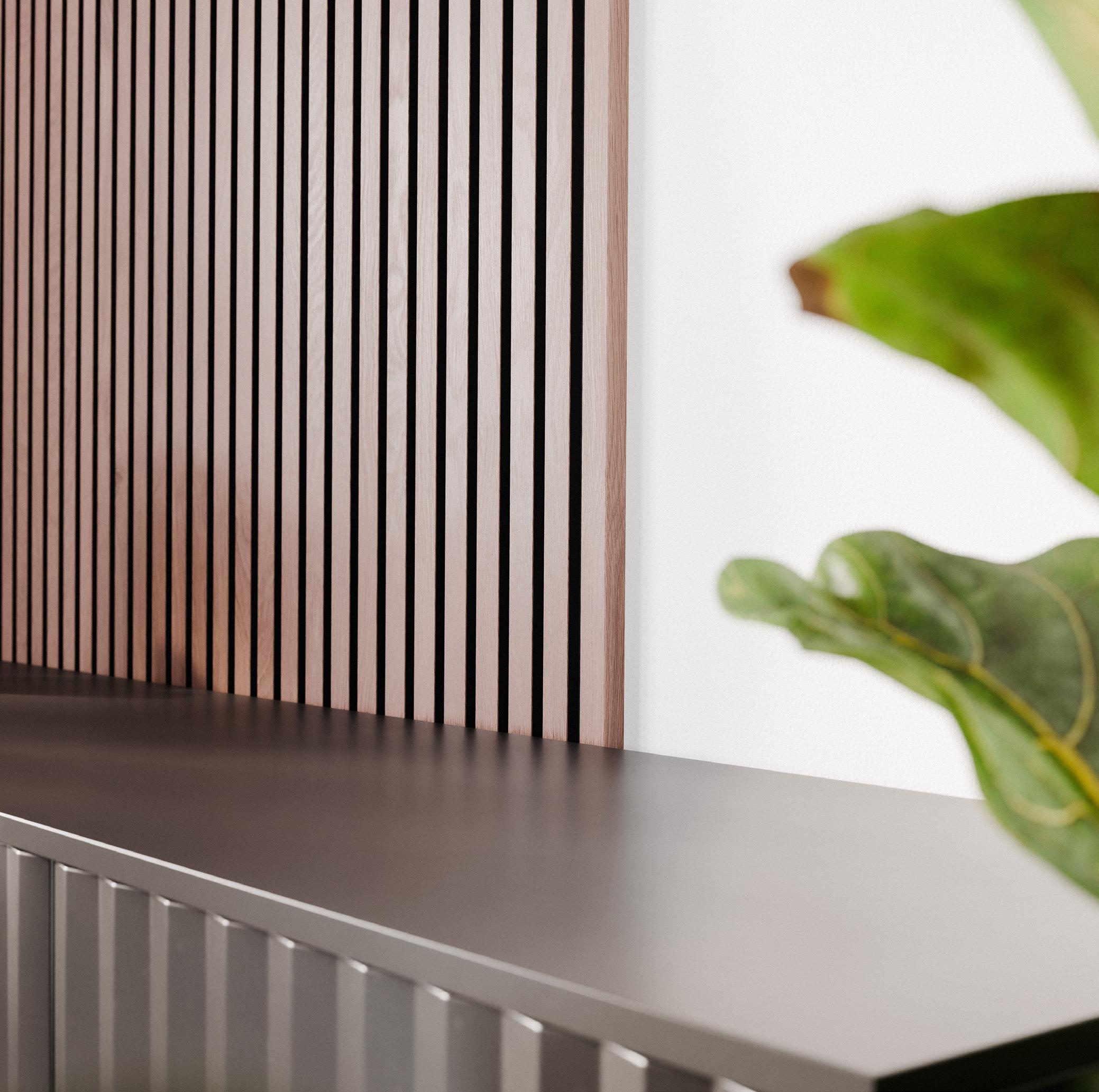 Our LUX panels differ from our other acoustic panels in that they have wider slats and slats where the real wood veneer is visible on the front and sides. This gives them a completely unique look.