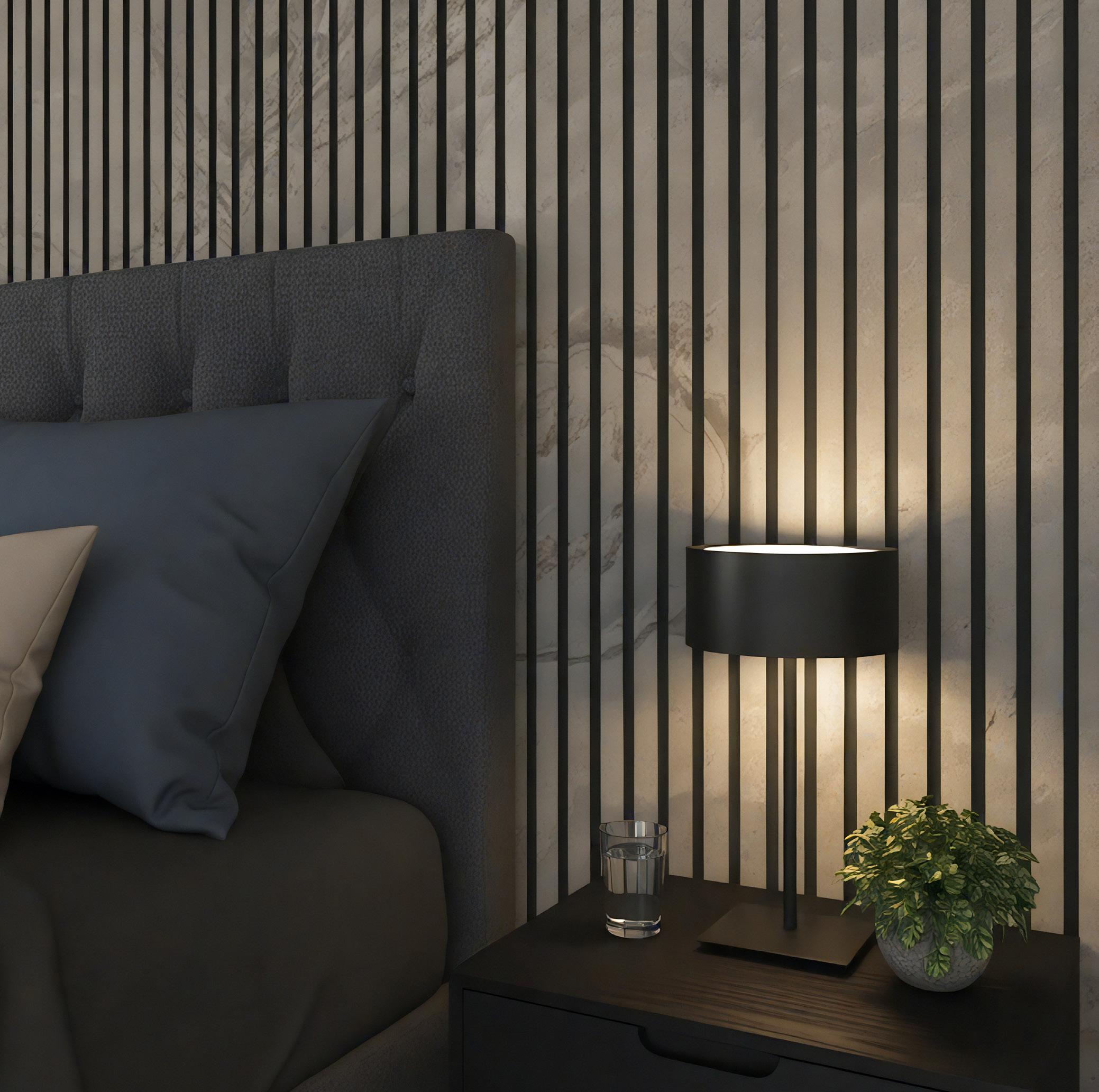 Bedroomwithacousticpanelsontheendwall.Theslim,verticalslatscreateacalmandexclusivelookthat elegantlyframesthebed.Anatmosphericsolutionwhereacoustics,materialsandsoftlightingcometogether in a harmonious whole.